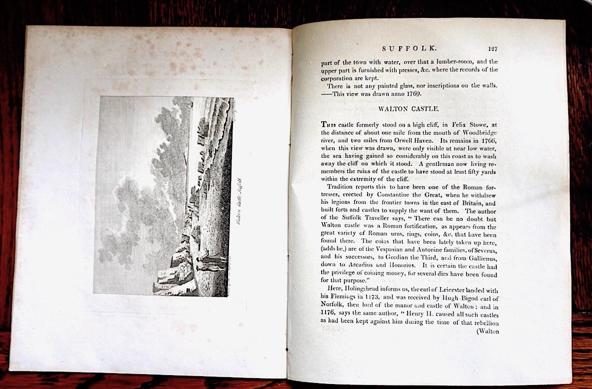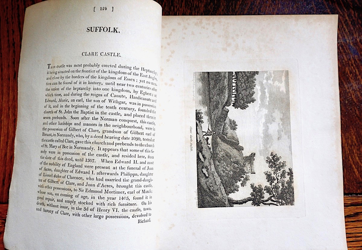 3 Antique Engravings Prints, Suffolk, 1785-1787, cm. 26,5 x 21, pp. 12, from ancient book: Clare Castle, Suffolk (12 April 1787); Tawn Hall at Ipswich (18 Sept. 1785); Walton Castle (9 Sept. 1786).