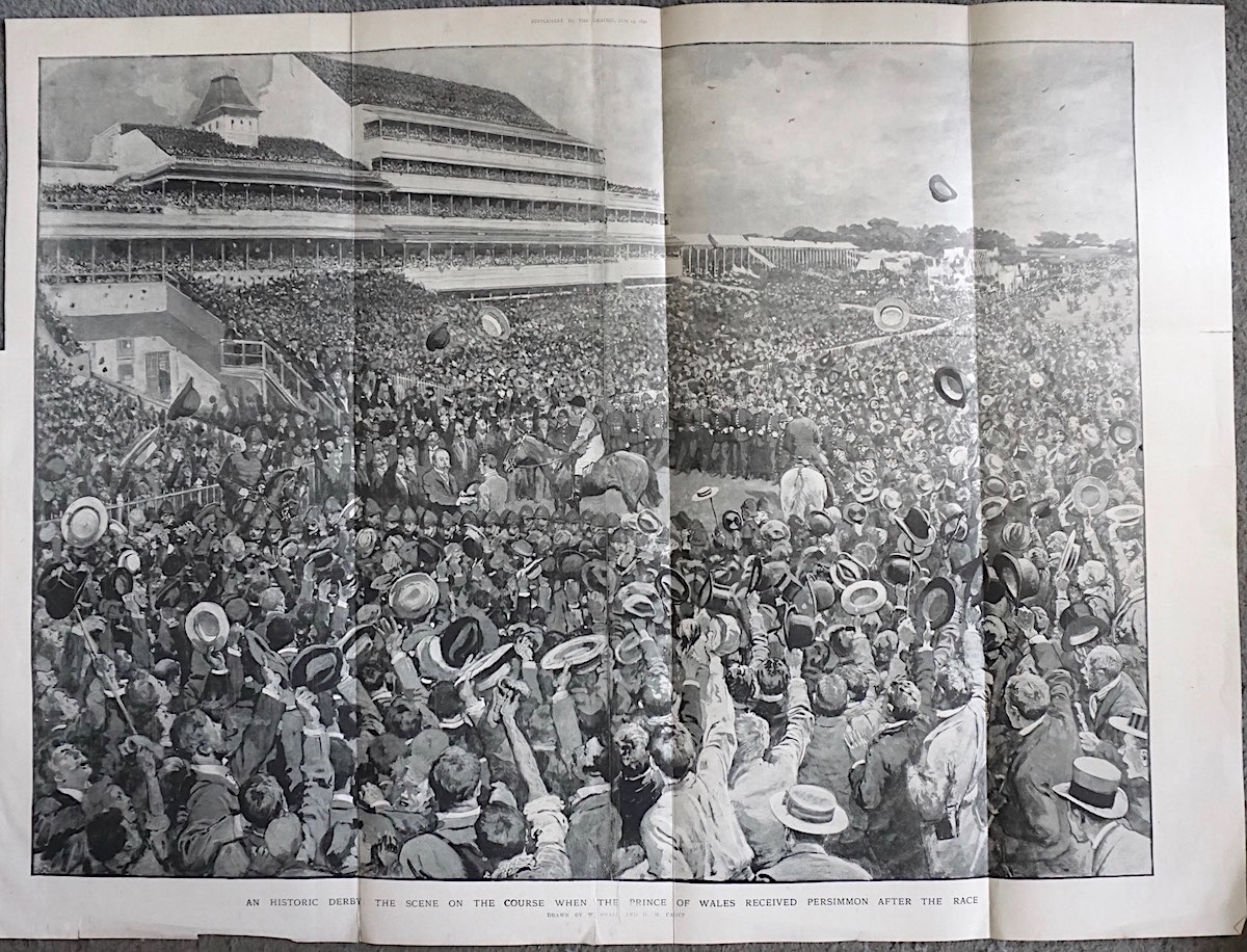 A Historic Derby, the Scene on the Course when the Prince of Wales received Persimmon after the Race. Illustration for The Graphic, 13 June 1896, 80 x 57 cm. Foldable.