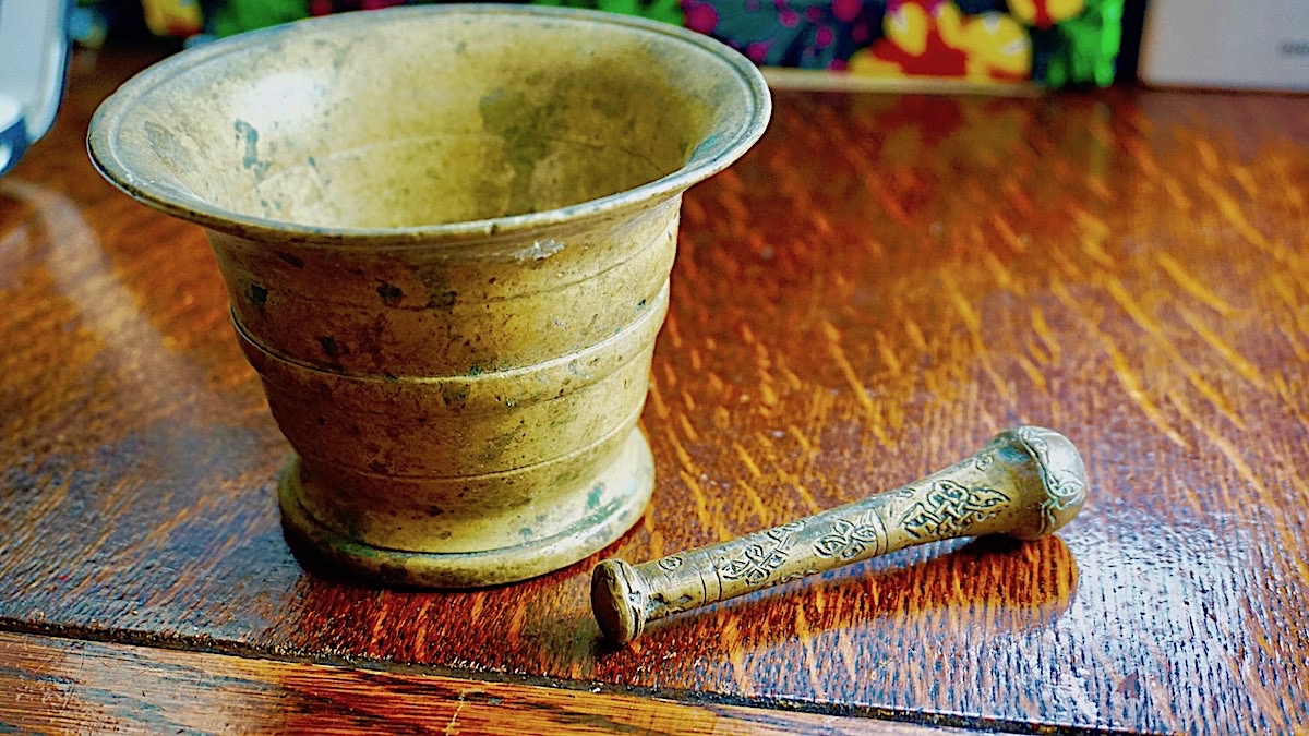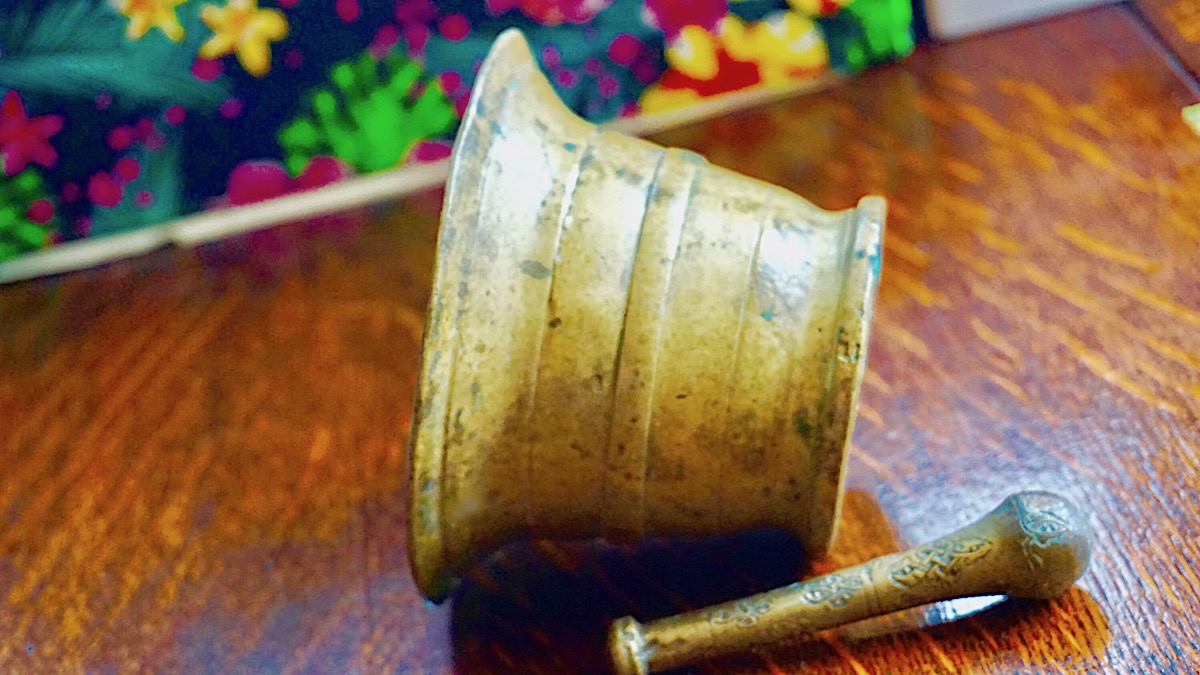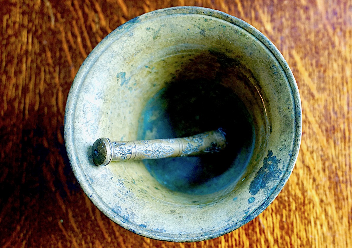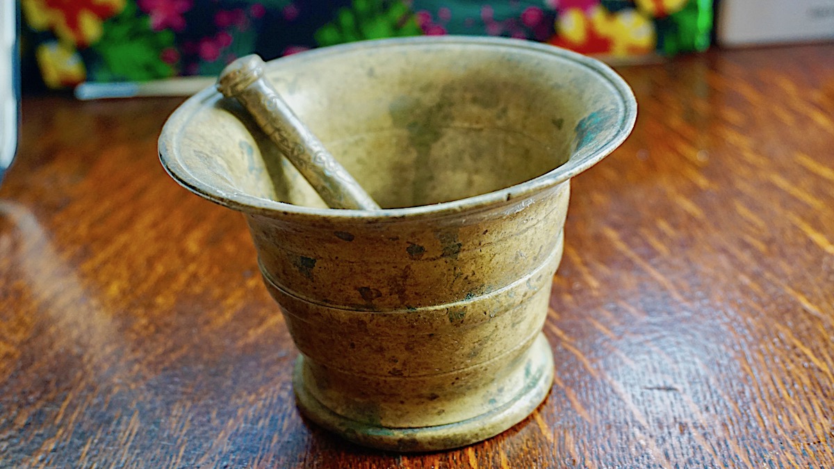 Antique 18th C. Solid Brass Mortar & Pestle, credit Antiche Curiosità©