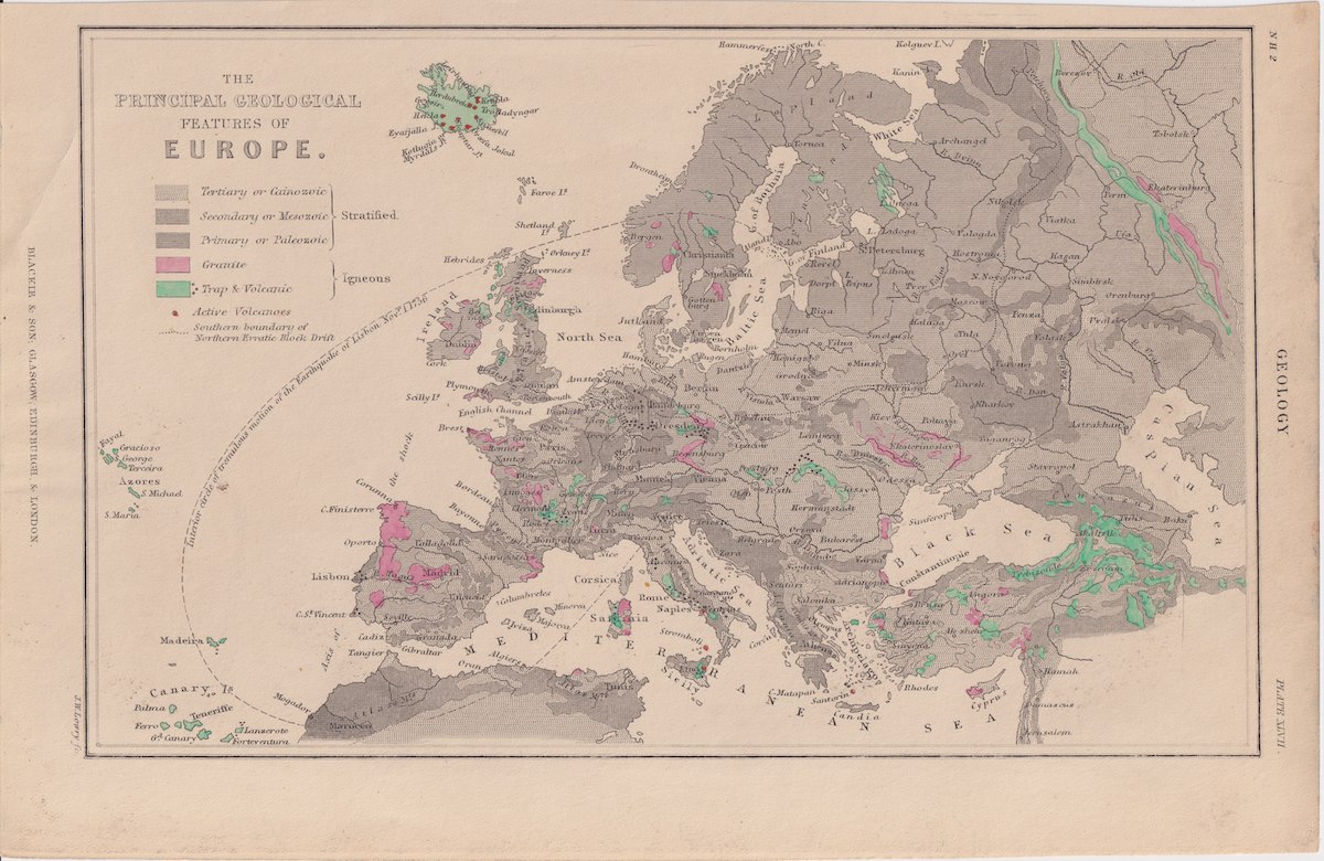 Antique Engraving Map, The Principal Geological features of Europe, 1874, credit Antiche Curiosità©