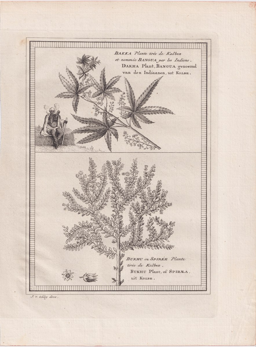 Antique Engraving Print, Bakka, Plante tirée de Kolben et nommée Bangua par les Indiens. Darkha Plant, Bangua genoemd van den Indiaanen, Kolbe, 1748, 25,5 x 19 cm.