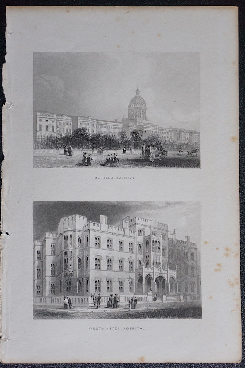 Antique Engraving Print, Bethlem Hospital; Westminster Hospital, 1850, 18,2 x 12,2 cm.