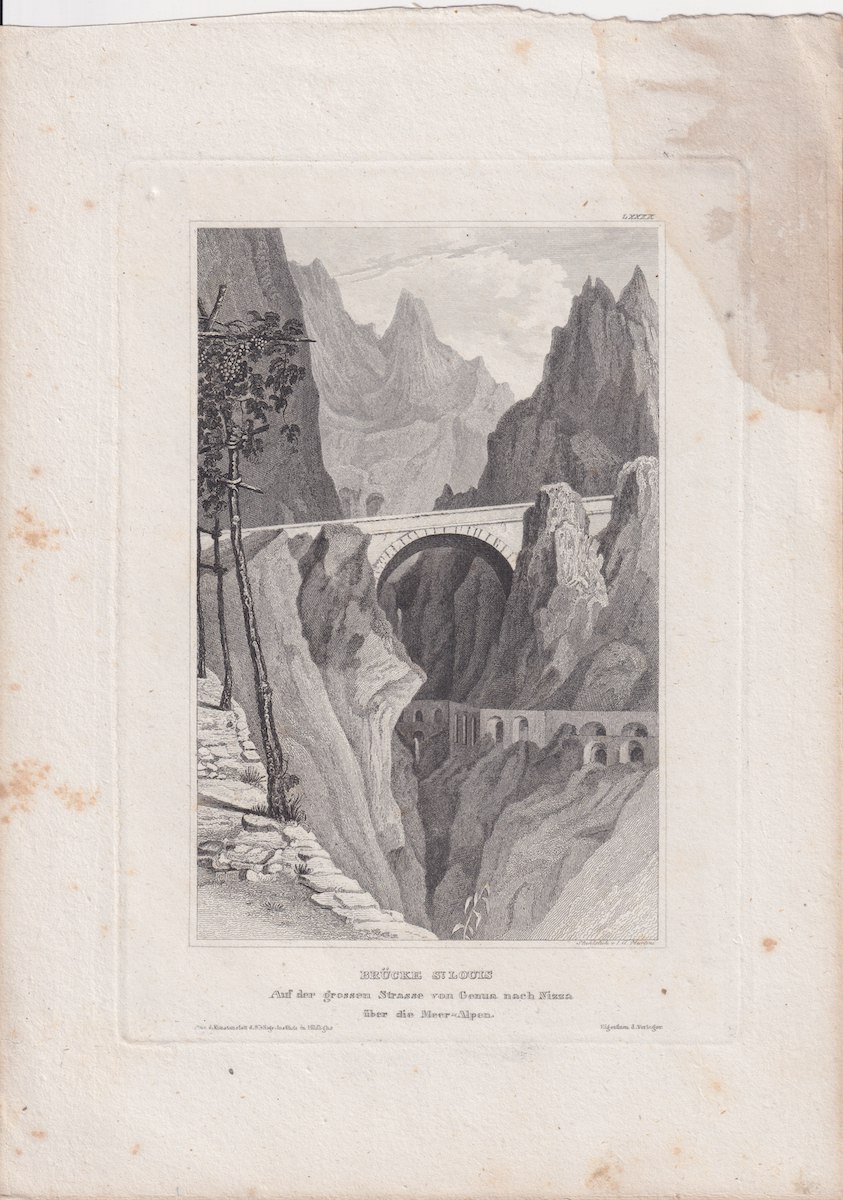 Antique Engraving Print, Brücke St. Louis, 1840, auf der grossen Strasse von Genua nach Nizza über die Meer-Alpen, 25.8 x 18.5 cm.