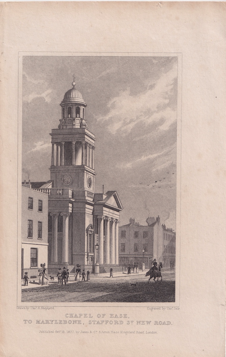 A beautiful original 19th-century engraving depicting the Chapel of Ease in Marylebone, Stafford Street, New Road – London.