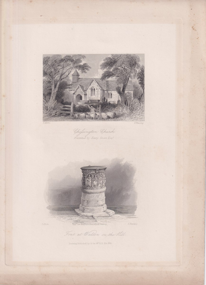 Antique Engraving Print, Chessington Church; Font at Watton on the Hill, 1845, 29.7 x 20.8 cm.