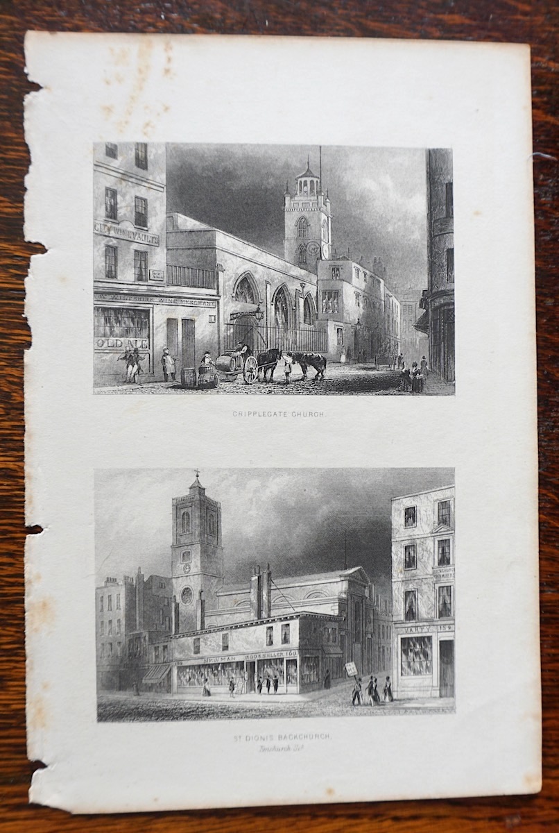 Antique Engraving Print, Cripplegate Church; St. Dionis Backchurch, 1850, 18,2 x 12,2 cm.