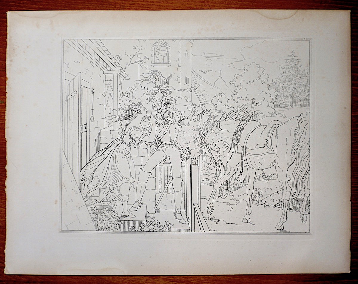 Antique Engraving Print, Doorstep conversation, 1820, cm. 32 x 24. Rare