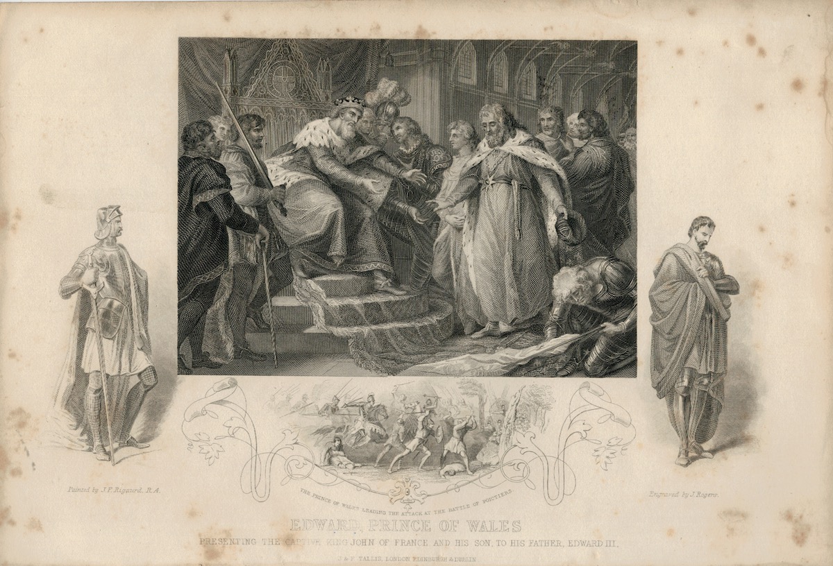Antique Engraving Print, Edward, Prince of Wales, Presenting the Captive King John of France and his Son to his Father Edward III, Painted by J.F.Rigaurd, Engraved by J. Rogers, cm. 26.5 x 18 ca., 1850.