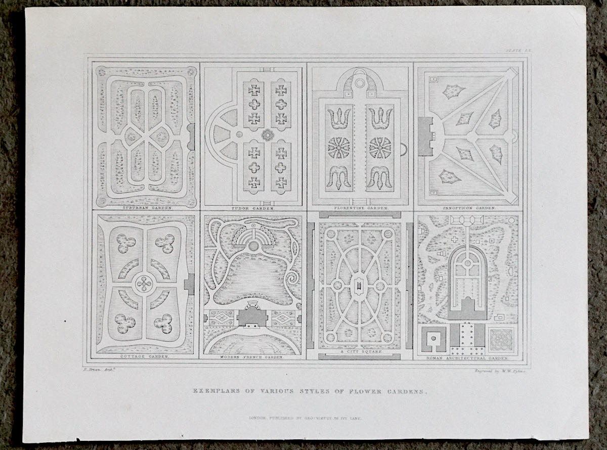 Antique Engraving Print, Exemplars of Various Styles of Flower Gardens, 1870, credit Antiche Curiosità©