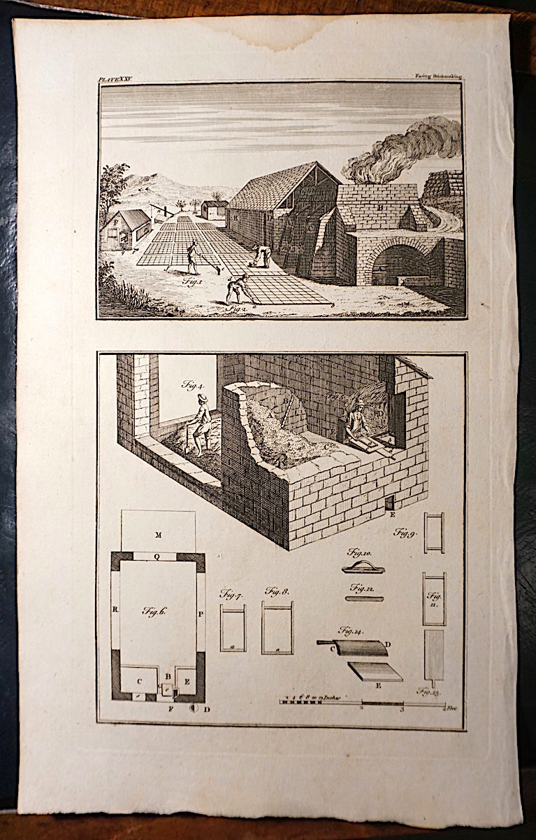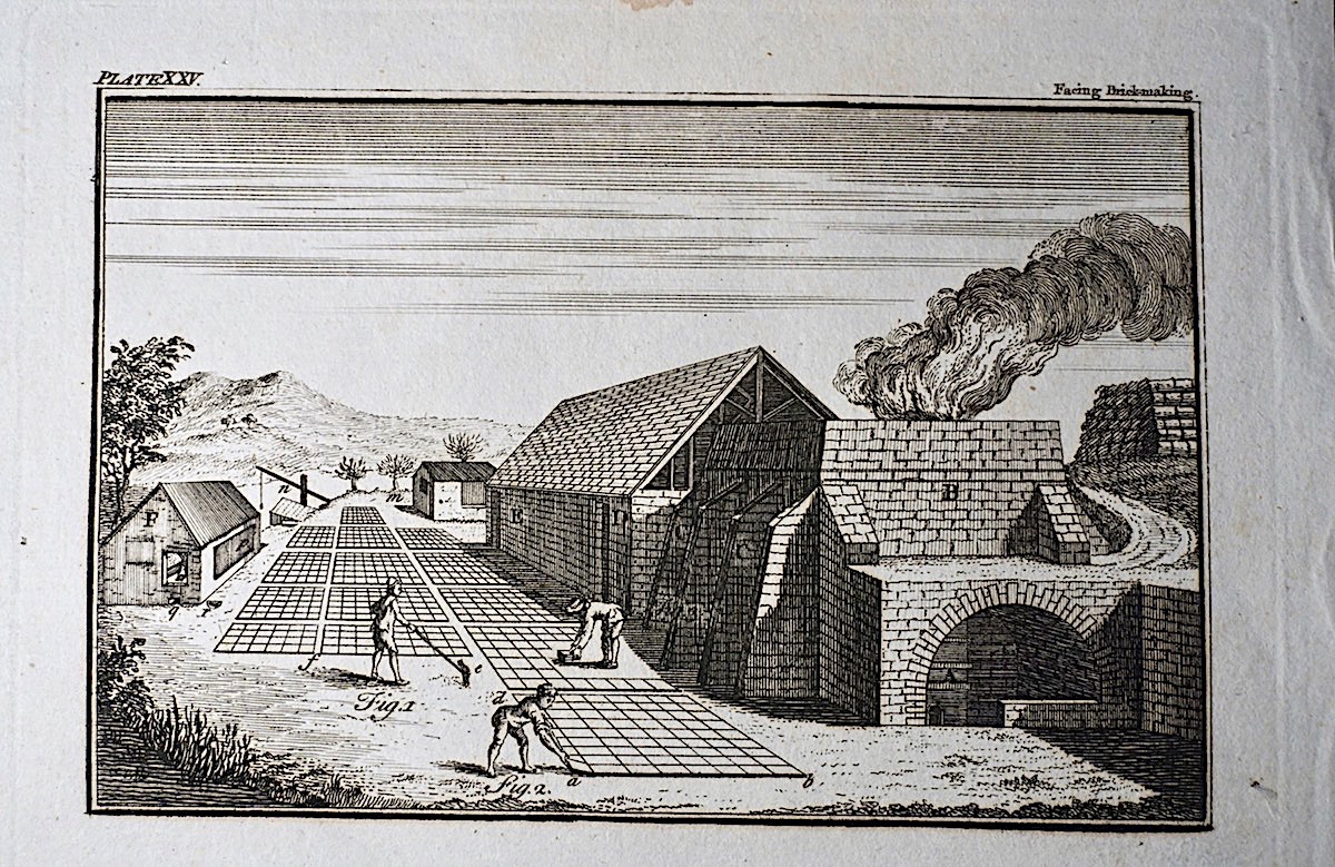 Antique Engraving Print, Facing Brick-making, 1765, cm. 36 x 22. Plate XXV. Rare. From The Complete Dictionary of Arts and Sciences, 1765.
