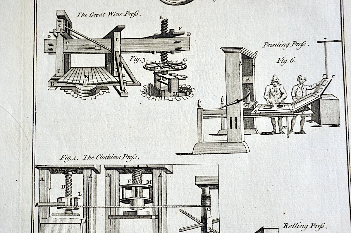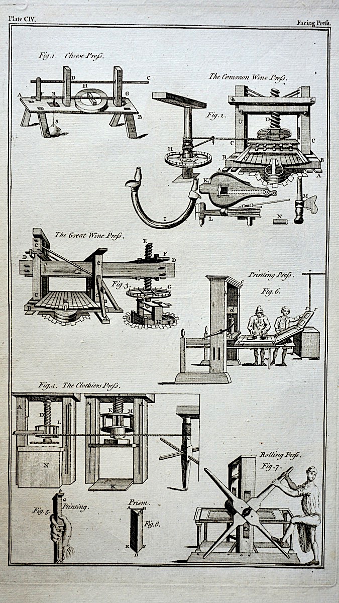 Antique Engraving Print, Facing Press, 1765, plate CIV, cm 36 x 22, from Complete Dictionary of Arts and Sciences, 1765. Rare.
