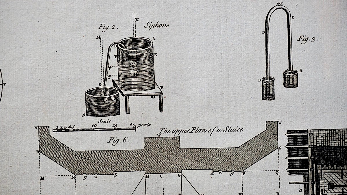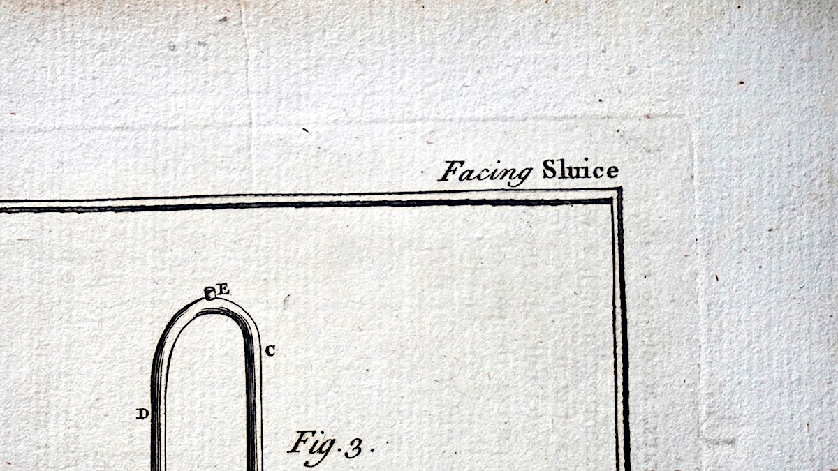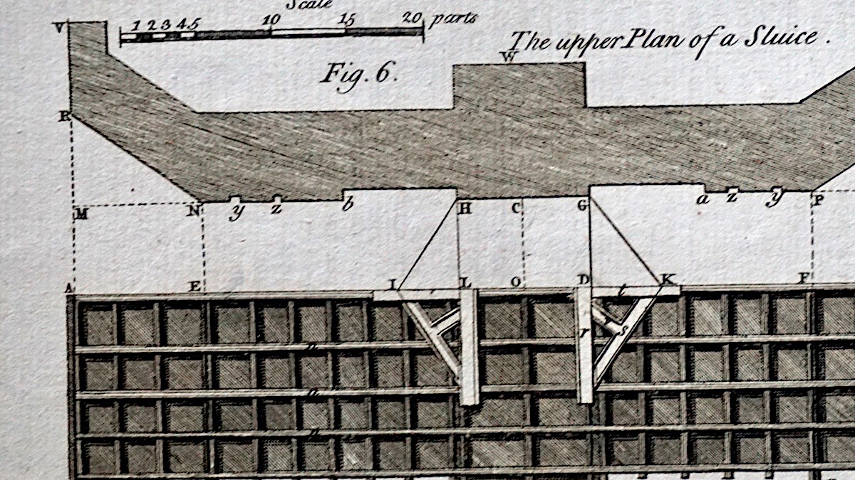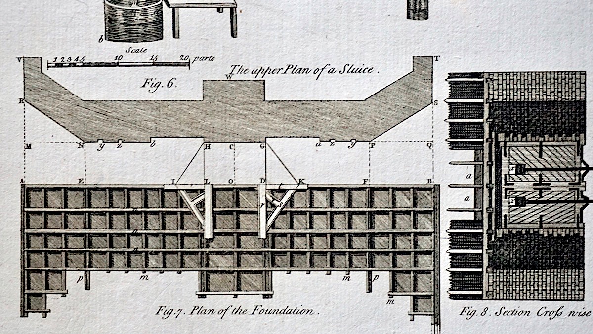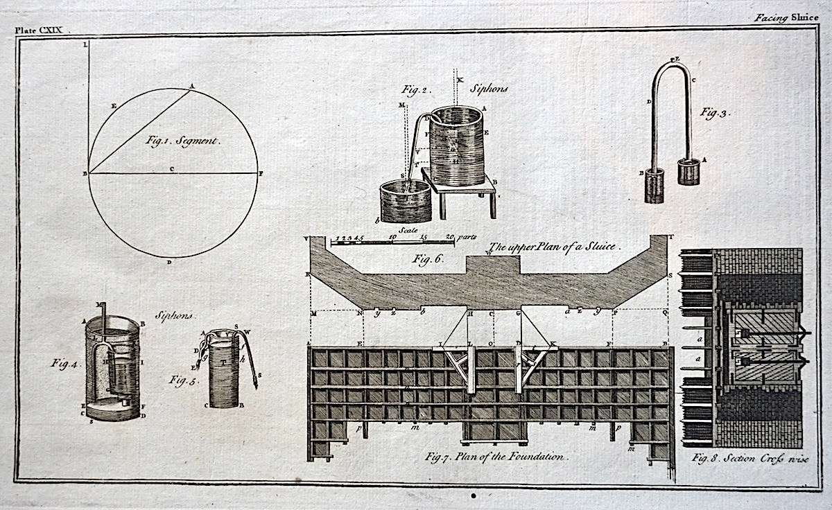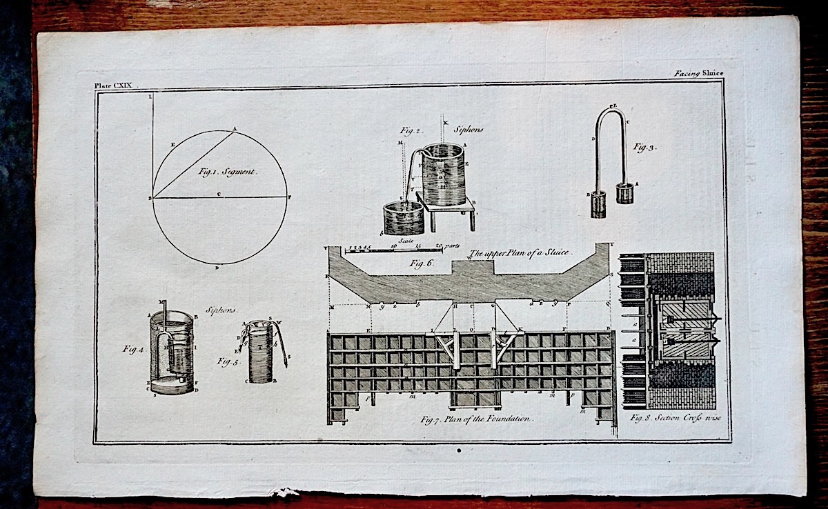 Antique Engraving Print, Facing Sluice, 1765, plate CXIX, cm 36 x 22. from Complete Dictionary of Arts and Sciences, 1765.