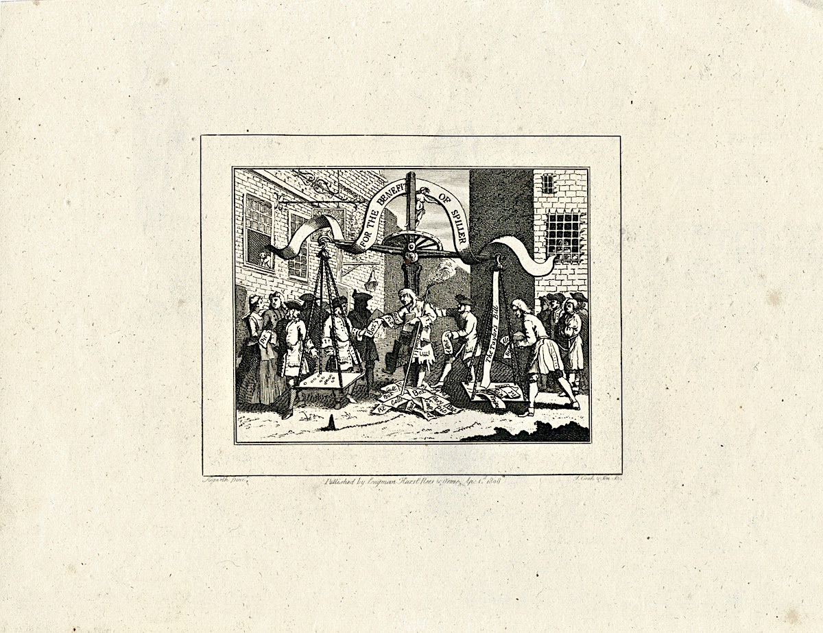 Antique Engraving print, For the Benefit of Spiller, 1808, cm. 29 x 21., published by Longman.