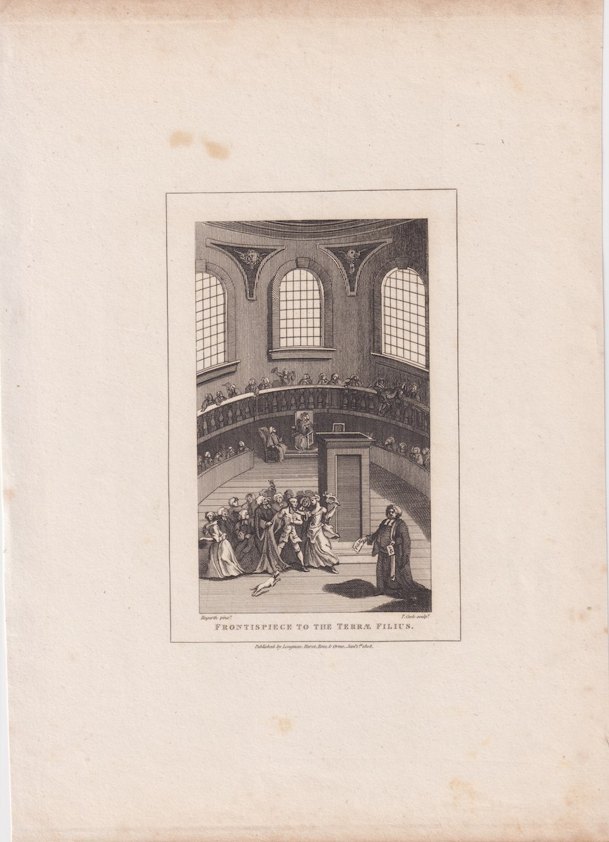 Antique Engraving Print, Frontispiece to the Terrae Filius, 1808, 21 x 29 cm.