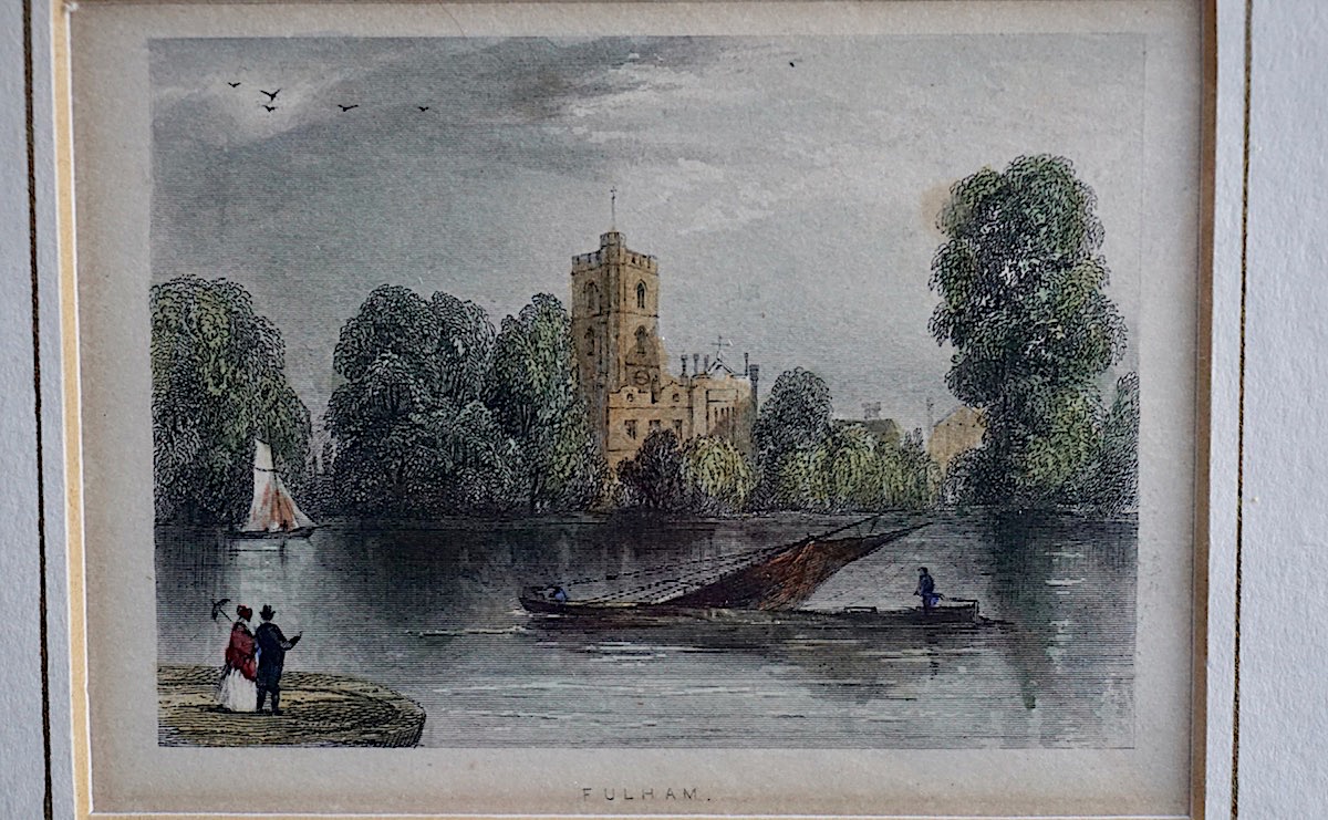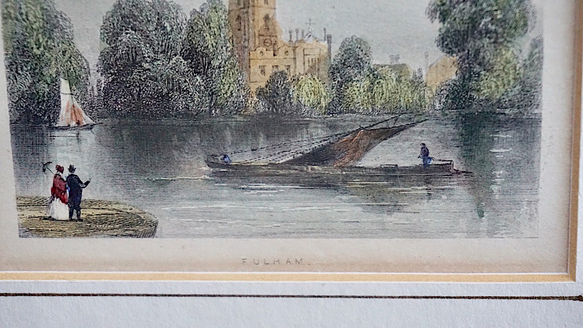 Antique Engraving Print: Fulham, [London : E. T. Brain & Co., 1847]. A charming small antique print of Fulham and the parish church of All Saints from the river. An engraving from the workshop of A. H. Payne, originally produced for Payne’s “Illustrated London, or a Series of Views in the British Metropolis and its Vicinity” (London : 1846-1847). Hand coloured