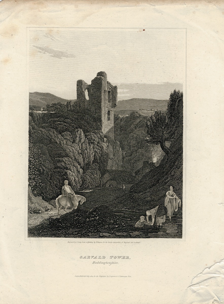 Antique Engraving Print, Garvald Tower, Haddingtonshire, 1815, engraved by J. Greig, 28 x 21,4 cm.