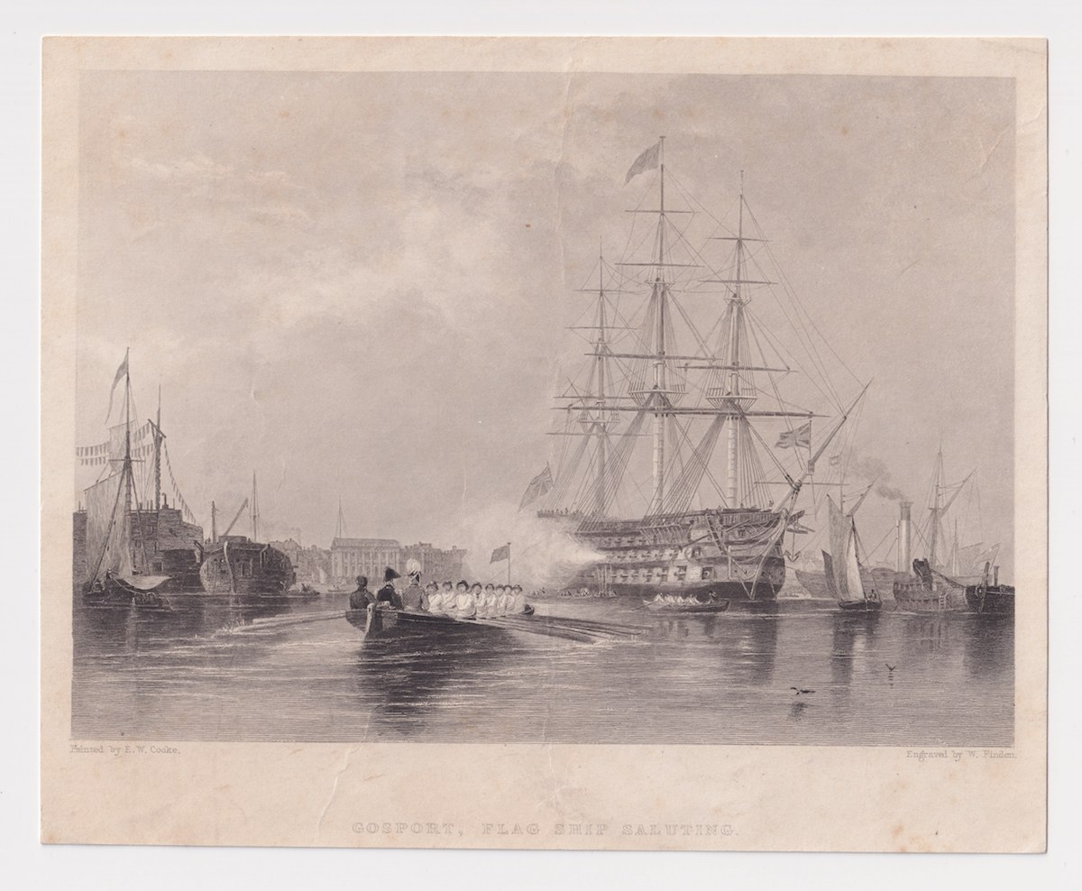 Antique Engraving Print, Gosport, Flag Ship Saluting, 1842, credit Antiche Curiosità©