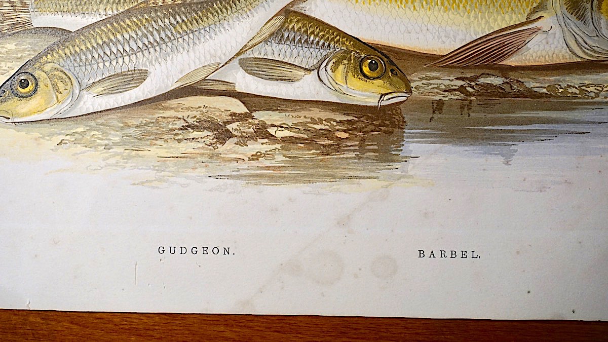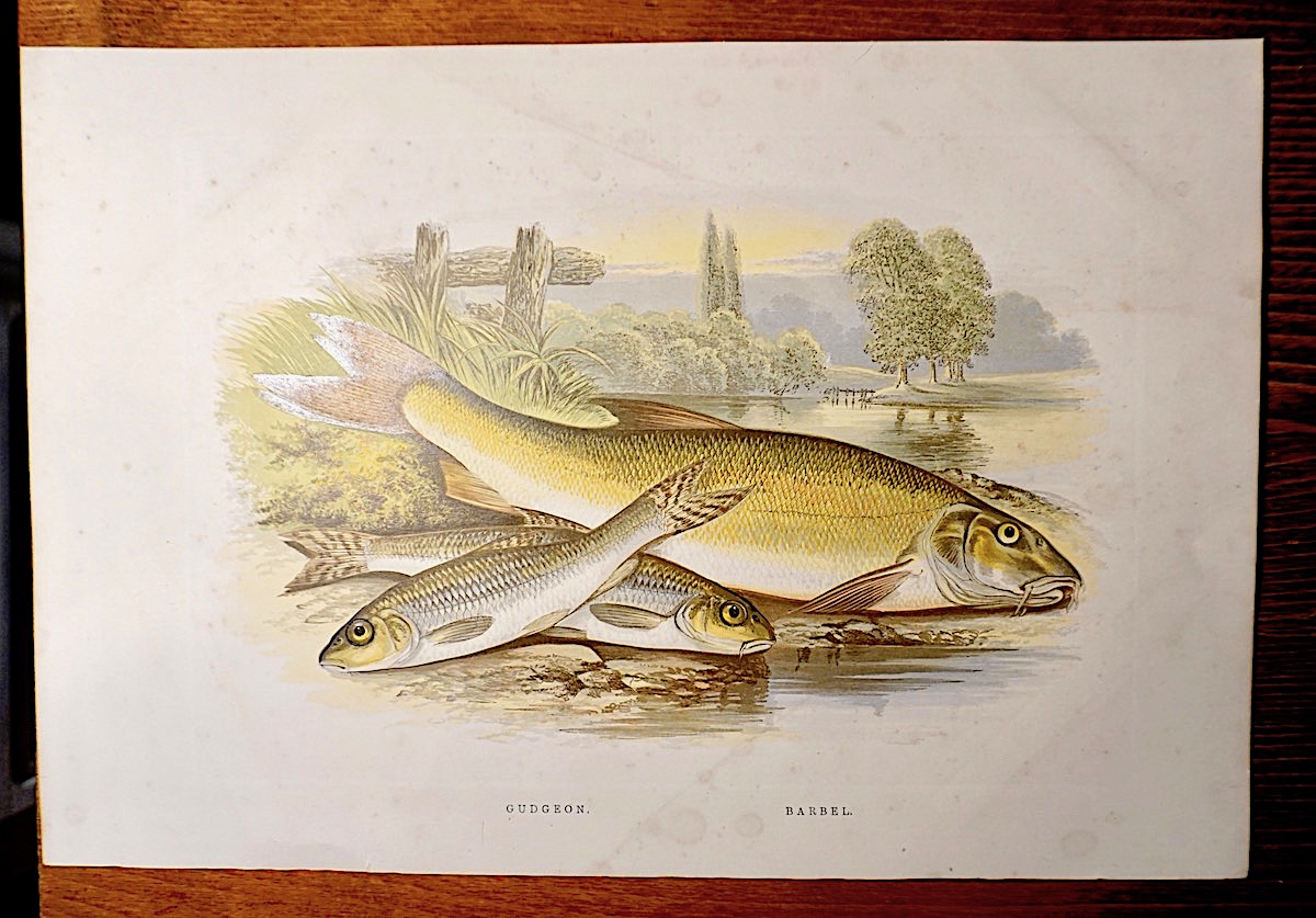 Antique Engraving Print, Gudgeon, Barbel, 1879, cm. 37 x 25. Rare.