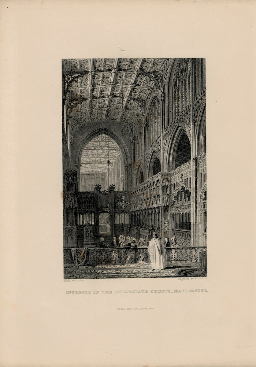 Antique Engraving Print, Interior of the Collegiate Church, Manchester, 1844, engraved by E. Callis, Fisher, Son & Co. London, 27 x 19 cm.