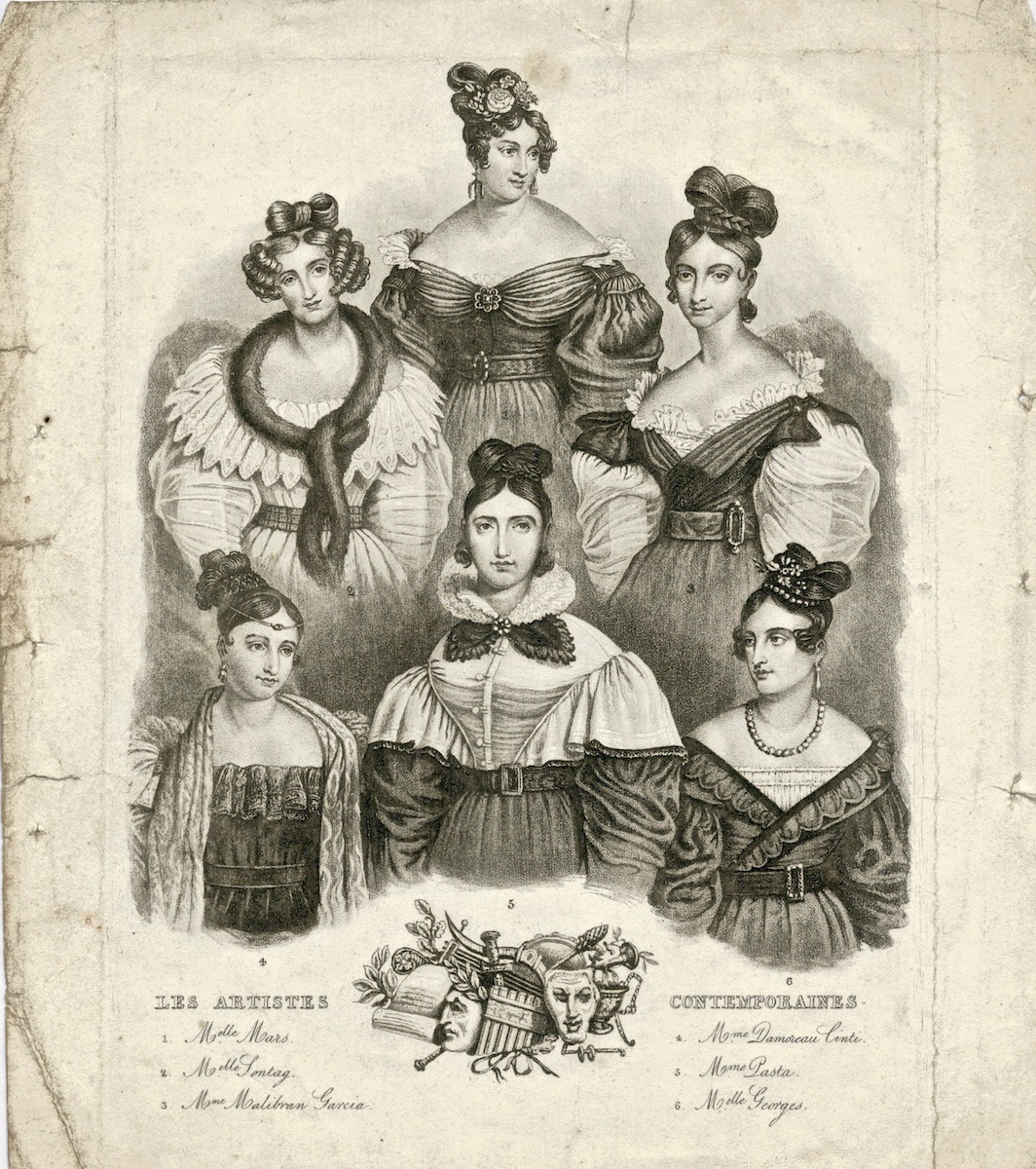 Antique Engraving Print, Les artistes contemporaines, 1830, cm. 22 x 20, M.lle Mars, M.lle Sontag, Mme Malibran Garcia, M.me Damoreau Cinti, Mme Pasta, M.lle Georges.