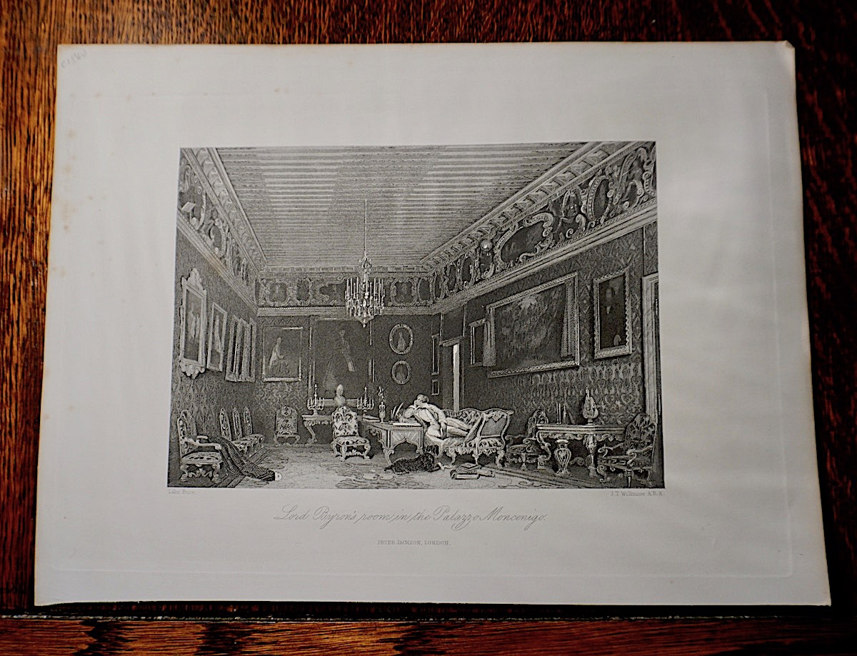 Antique Engraving Print: Lord Byron’s room in the Palazzo Moncenigo, 1841, engraved by J.T. Willmore after L. Price, 1841, 27 x 20 cm. Very good condition.