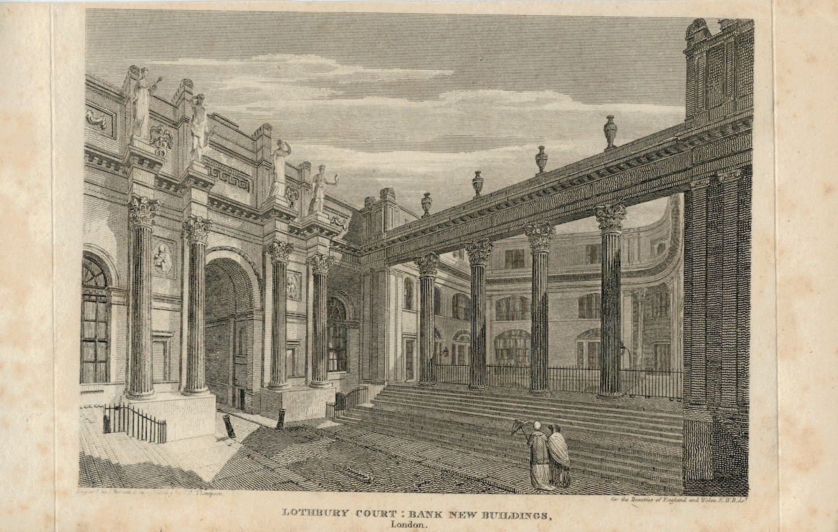 Antique Engraving Print, Lothbury Court: Bank New Buildings, 1809, 20 x 12,8 cm. Engraved by the Scottish engraver John Burnet (1784-1868) from an original study by the painter and architect James Robert Thompson (fl.1806-1848). Originally produced for the part-work “Beauties of England and Wales” (1801-1816).