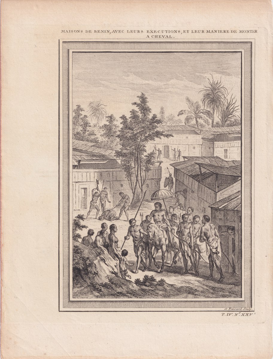 Antique Engraving Print, Maisons de Benin, avec leurs Executions, et leur maniere de monter à cheval, 1747, 25,6 x 19,5 cm.