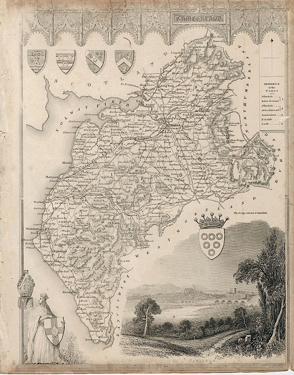 Antique Engraving Cumberland decorative early Victorian map of the county showing the railways. The map is embellished with a large vignette view of Carlisle, figure with a shield and five coats of arms. Gothic pillars and arches frame the map. cm. 26,5 x 22. Uncoloured. 1850.