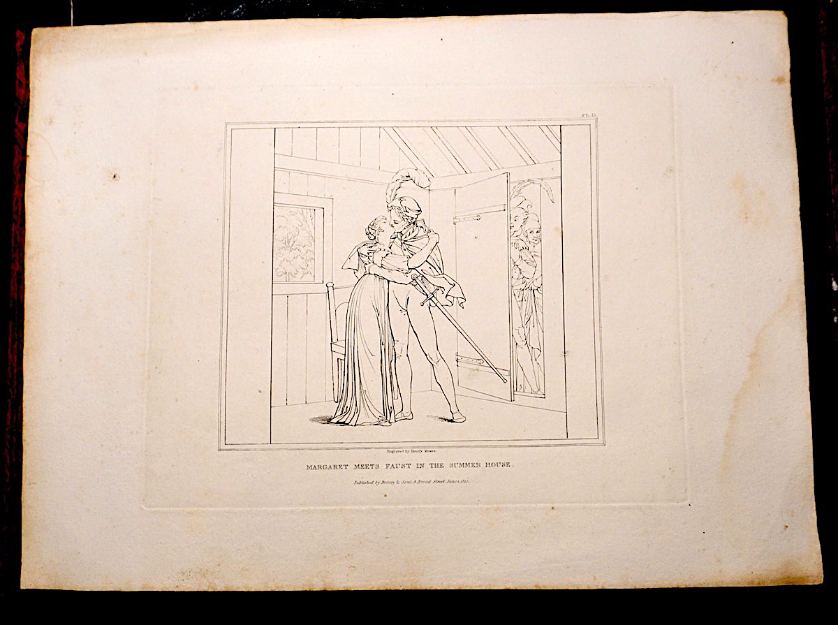 Antique Engraving print, Margaret meets Faust in the Summer House, 1820,