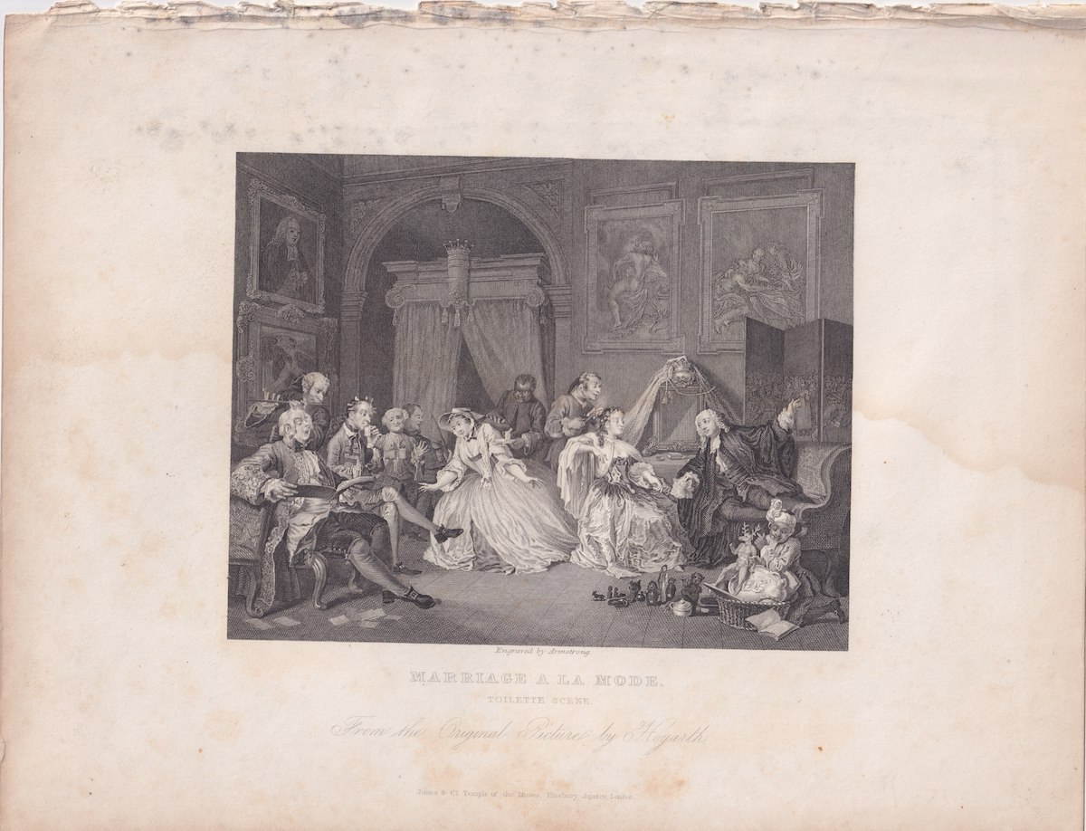 Antique Engraving Print, Marriage a la mode, Toilette Scene, Humour, engraved by Armstrong, from the original picture by Hogarth, 1820, 26.5 x 20.4 cm.