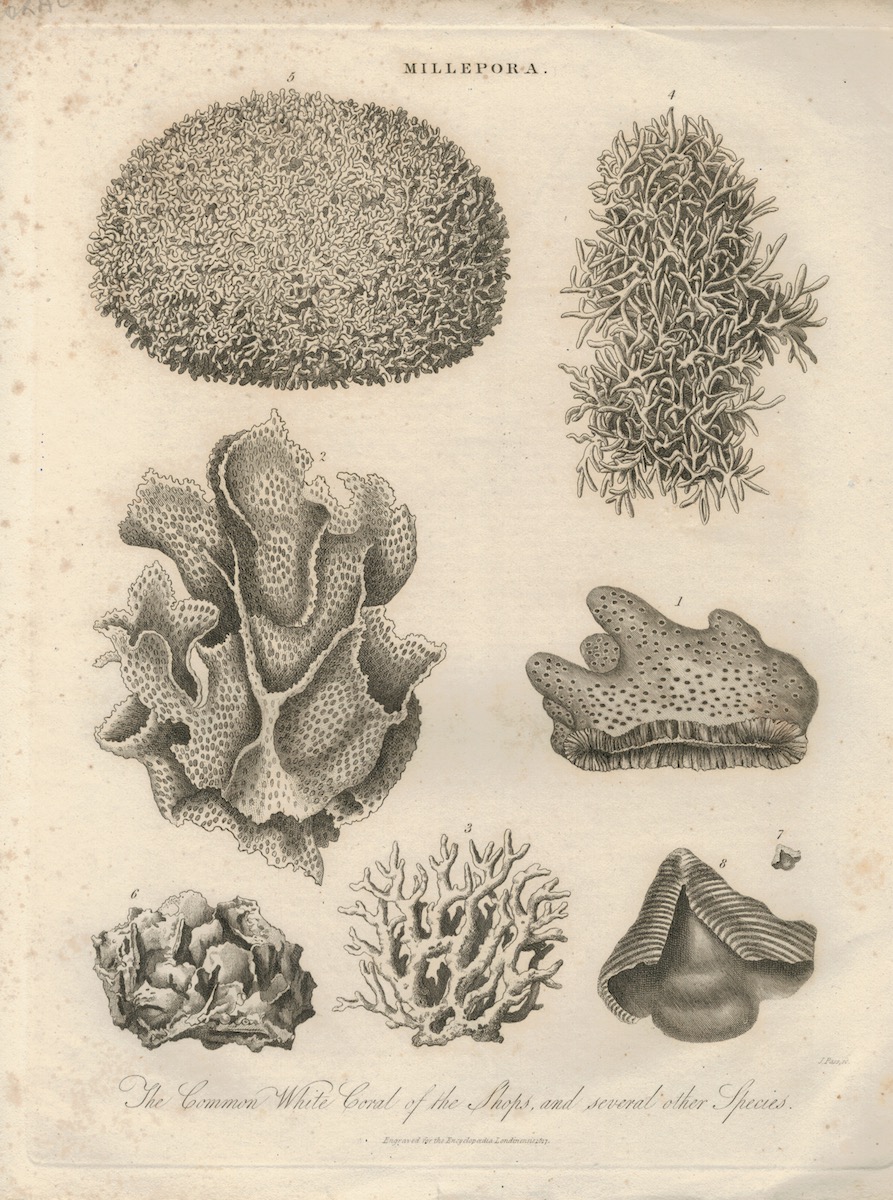 Antique Engraving Print, Millepora, cm. 28 x 22. The Common White Coral of the Shops and Several other Species. Engraved for the Encyclopoedia Londinensis, 1817.