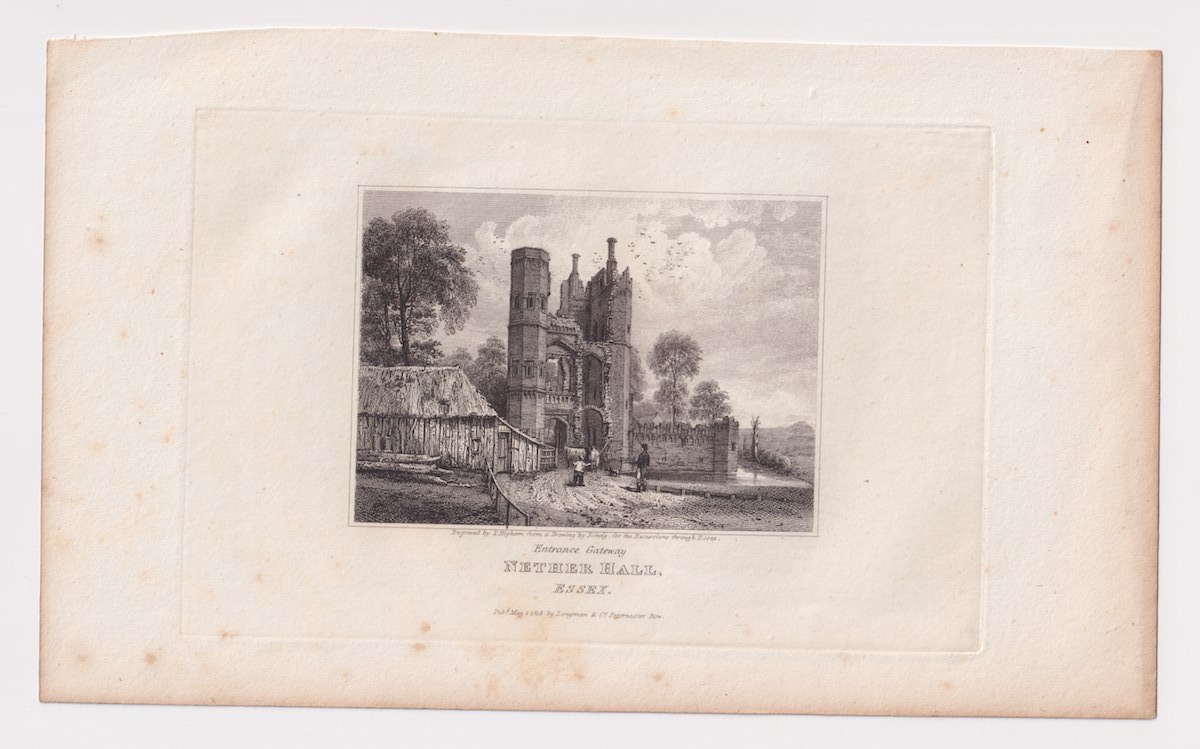 Antique Engraving Print, Nether Hall, Essex, 1818, 21 x 12,7 cm. Engraved by Higham.
