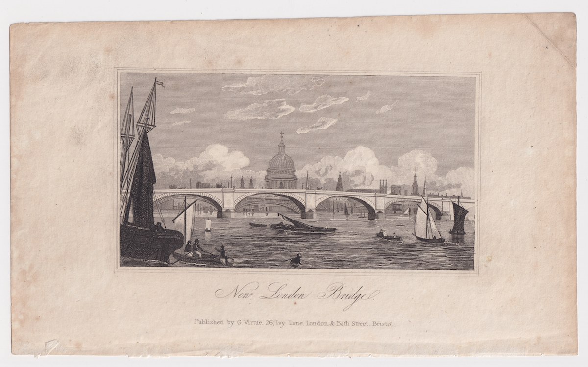 Antique Engraving Print, New London Bridge, 1830 ca. credit Antiche Curiosità©