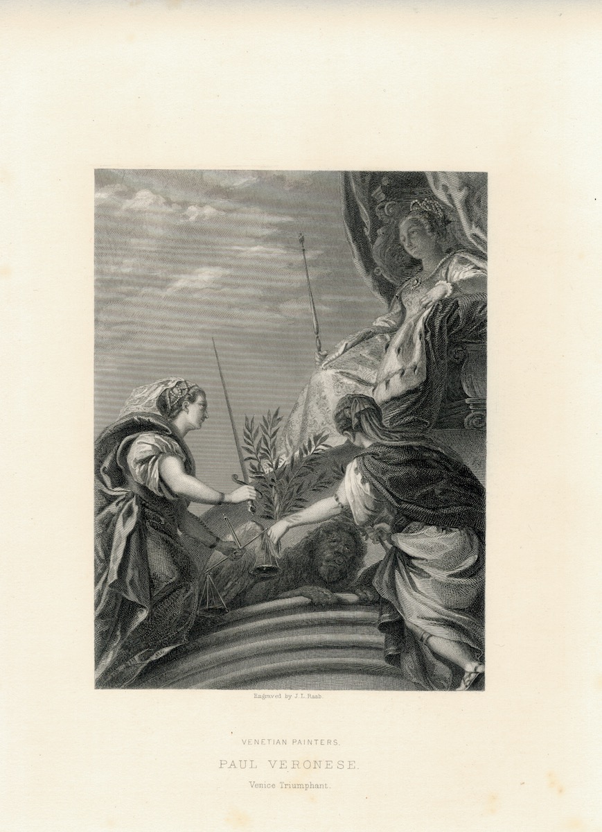 Antique Engraving Print, Paul Veronese, Venice Triumphant, 1873, 32 x 22 cm. Engraved by J.L. Raab.