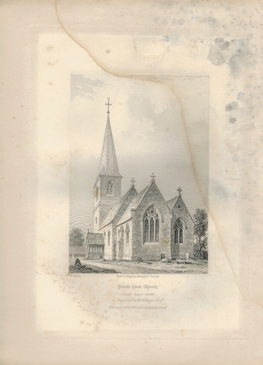 Antique Engraving Print, Peper Hara Church, 1845, Surrey, 29,5 x 23 cm.