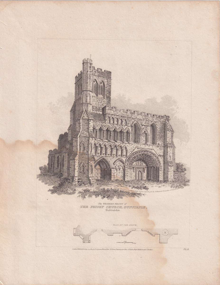 Antique Engraving Print, Priory Church, Dunstaple, 1805