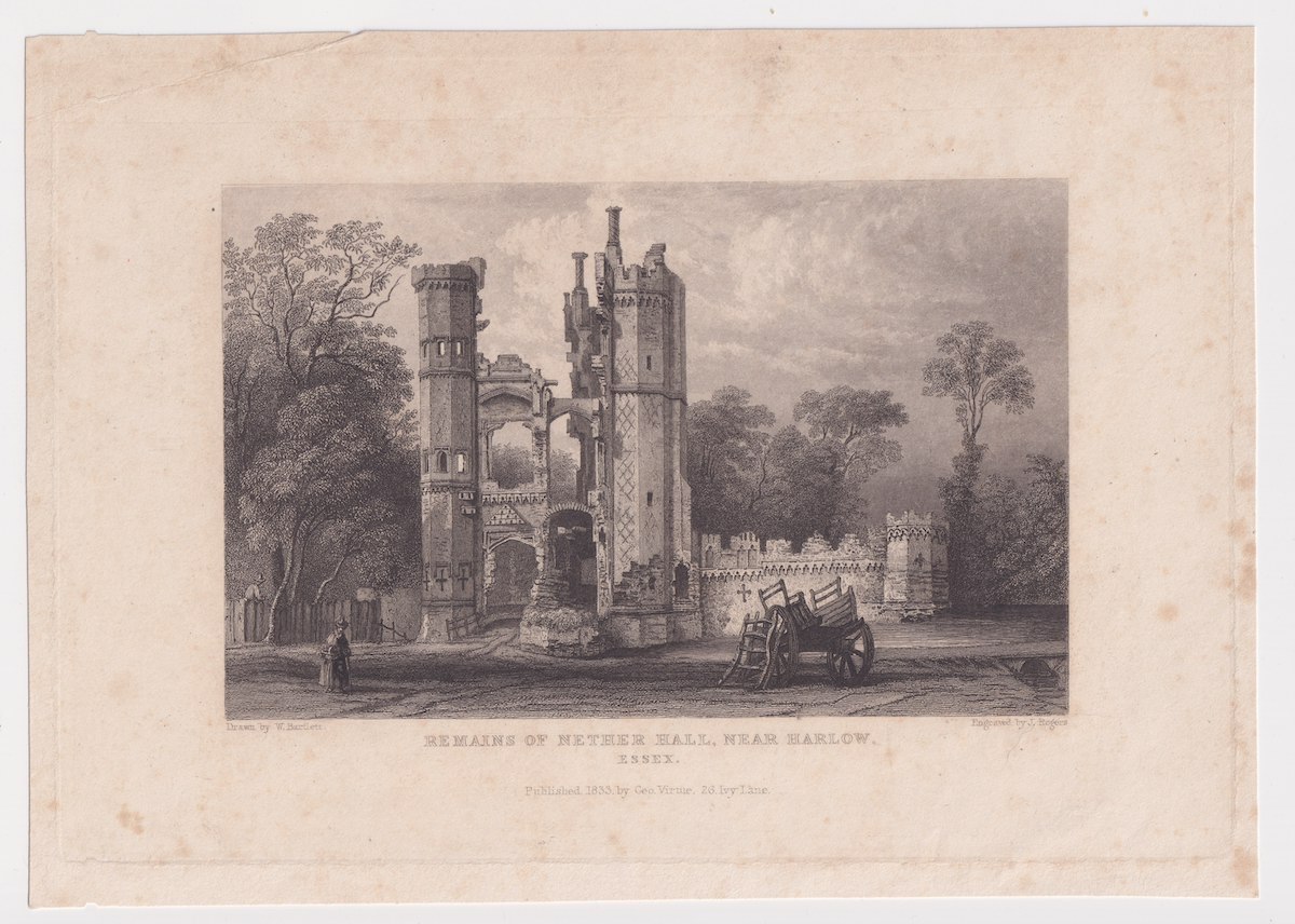 Antique Engraving Print, Remains of Nether Hall, Near Harlow, 1833, 23.2 x 16.5 cm.