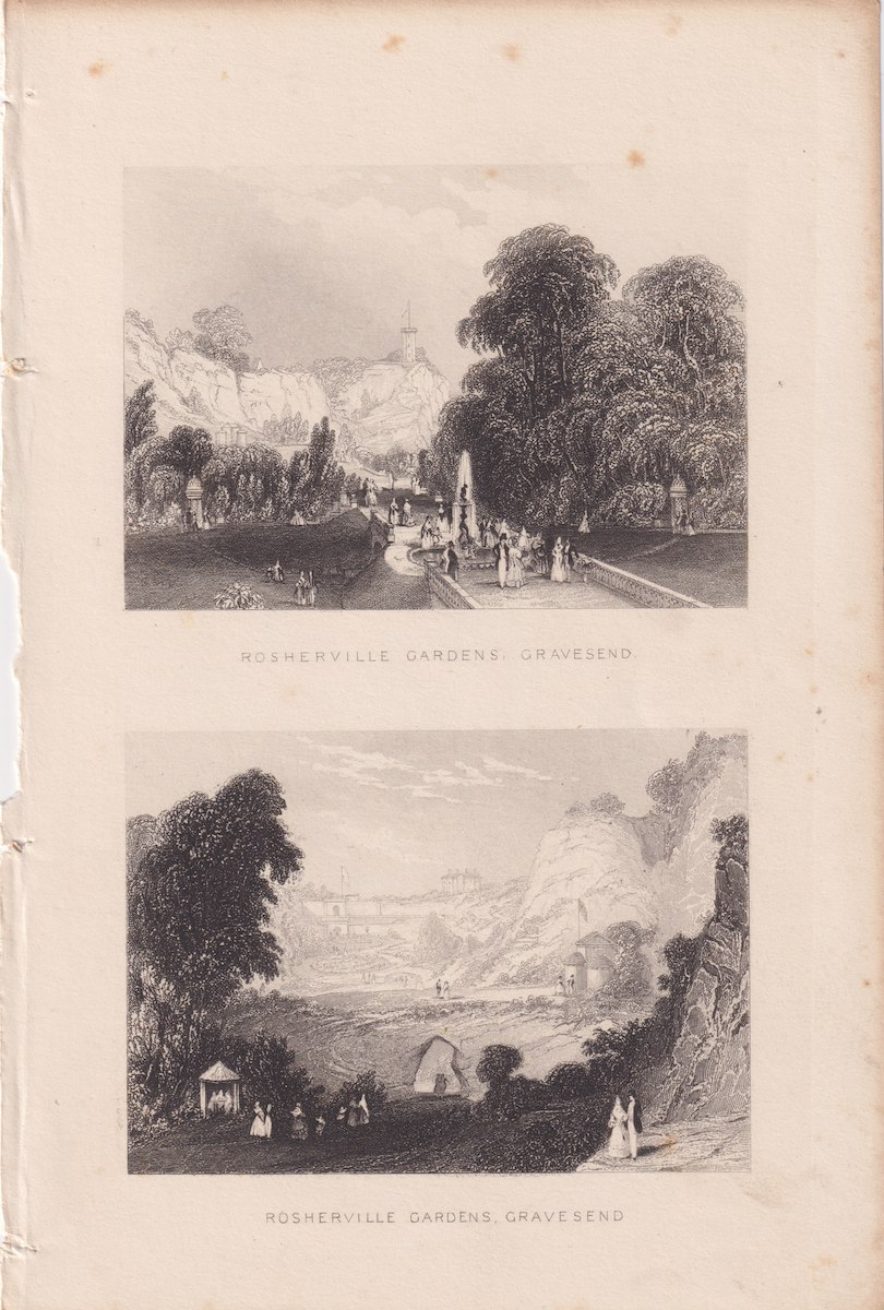Antique Engraving Print, Rosherville Gardens Gravesend, 1820 ca. 12.1 x 18.3 cm.