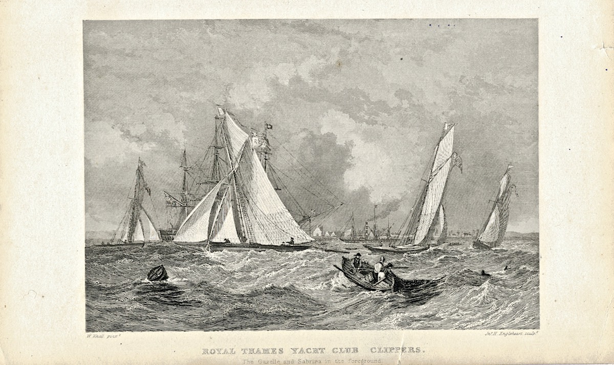 Antique Engraving Print, Royal Thames Yacht Club Clippers, The Gazelle and Sabrina in the foreground, 1839, cm. 21,4 x 13,3,