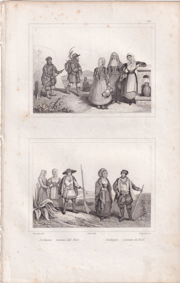 Antique Engraving Print, Sardegna, costumi del Nord, 1834, Costumes du Nord, From L’Italie, la Sicilie, les Iles Eoliennes, l’Ile d’Elbe, la Sardaigne, Malte, l’Ile de Calypso, par D. D. Parjasse.” 26.1 x 17 cm.
