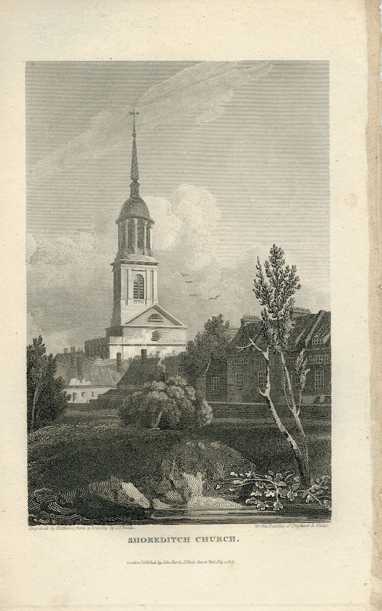 Antique Engraving Print, Shoreditch Church, 1816, cm. 20,6 x 13, from The Beauties of England & Wales, published by John Harrys, engraved by Matthews, drawing by Neale.