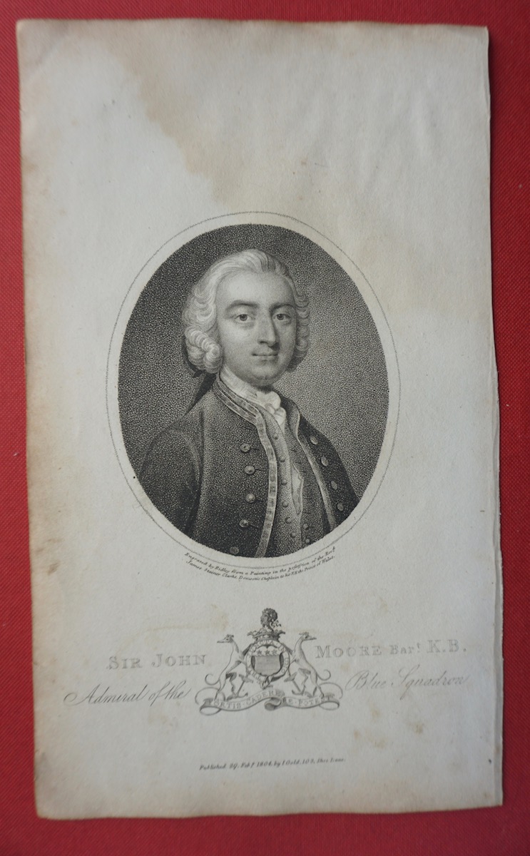Antique Engraving Print, Sir John Moore Bart K B Admiral of the Blue Squadron. Engraved by Ridley from a Painting in the possession of the Revd James Stainer Clarke, Domestic Chaplain to his R.H. the Prince of Wales, 1804, ca. 23 x 14 cm.