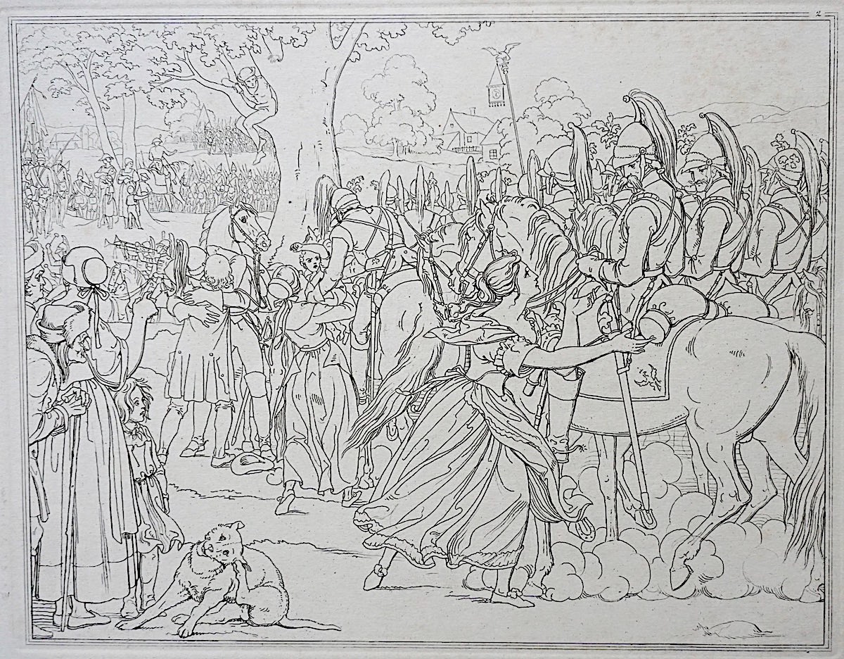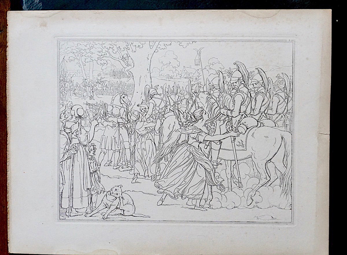 Antique Engraving print (Soldiers in the village), 1820, cm. 32 x 24. Rare