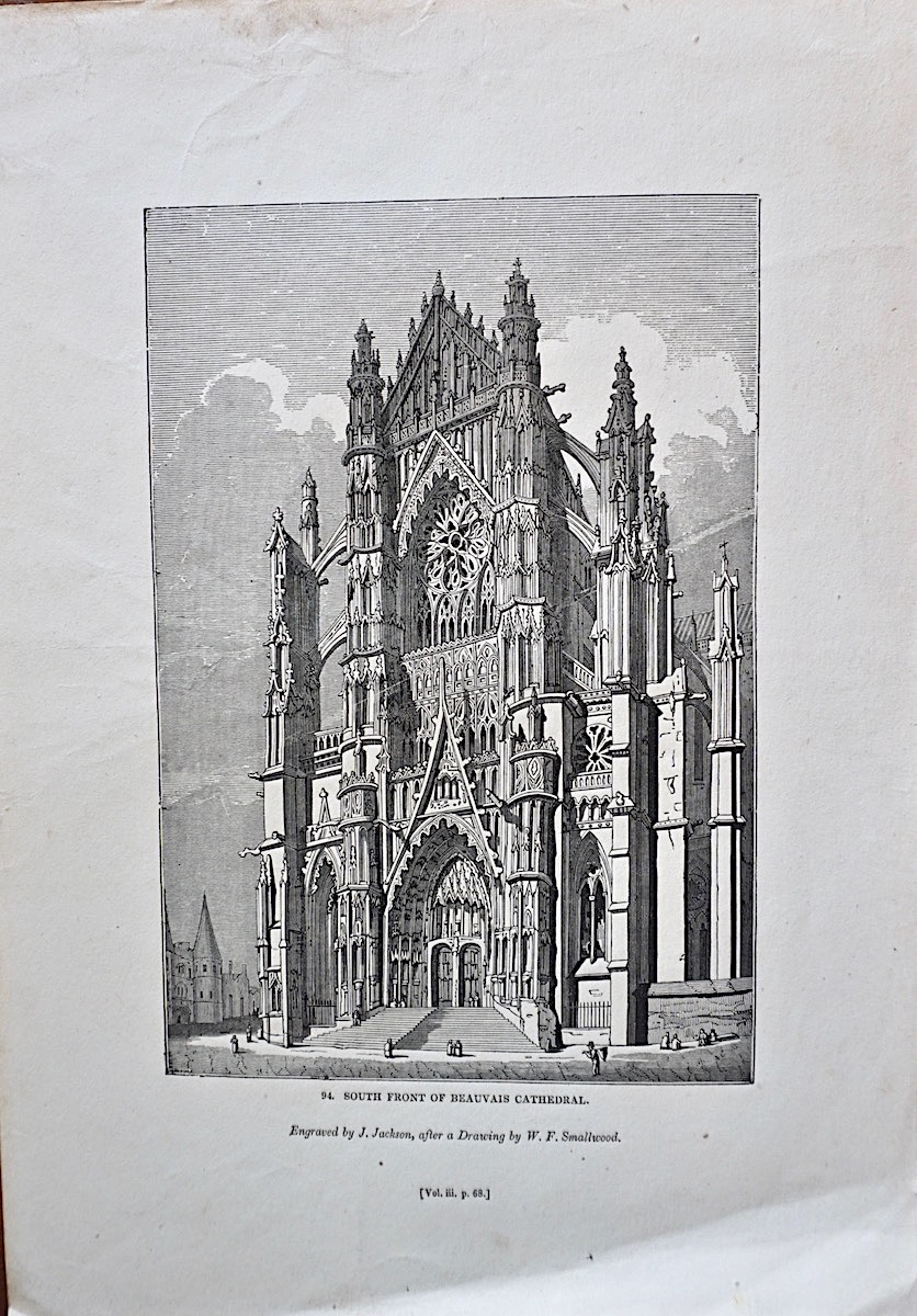 Antique Engraving Print, South Front of Beauvais Cathedral, 1835, cm. 34,4, x 24. Engraved by J. Jackson, after a drawing by Smallwood.
