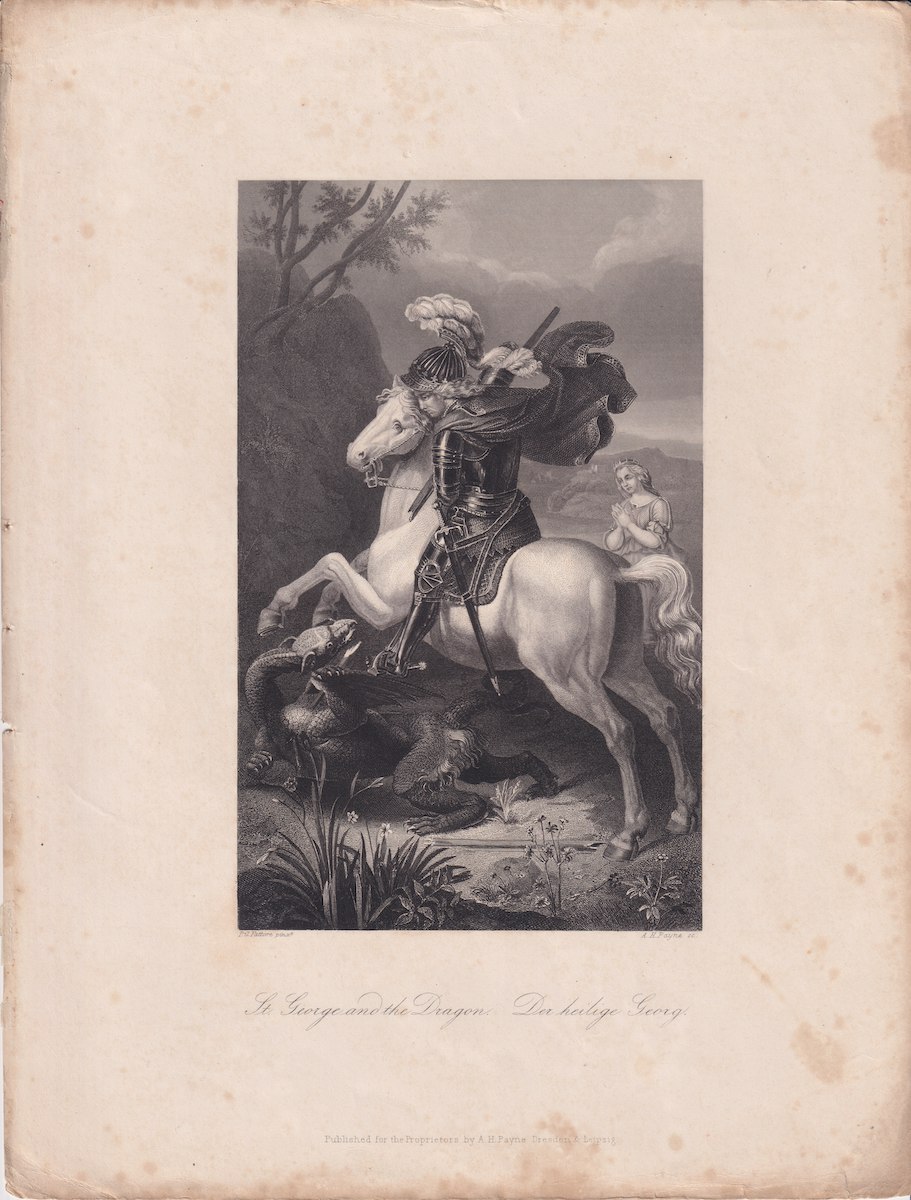 Antique Engraving Print, St. George and the Dragon, 1840 ca. 28.5 x 21.7 cm.