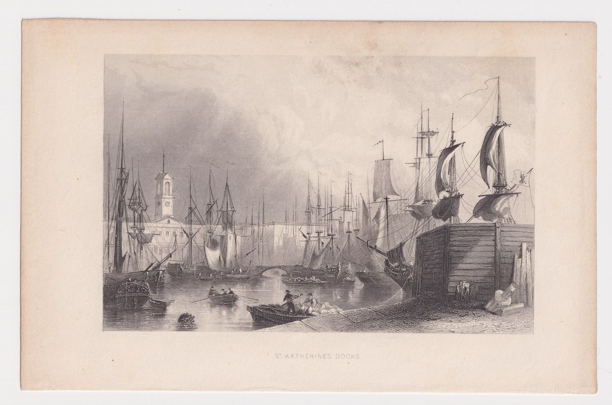 Antique Engraving Print, St. Katherine Docks, 1830 ca. credit Antiche Curiosità©