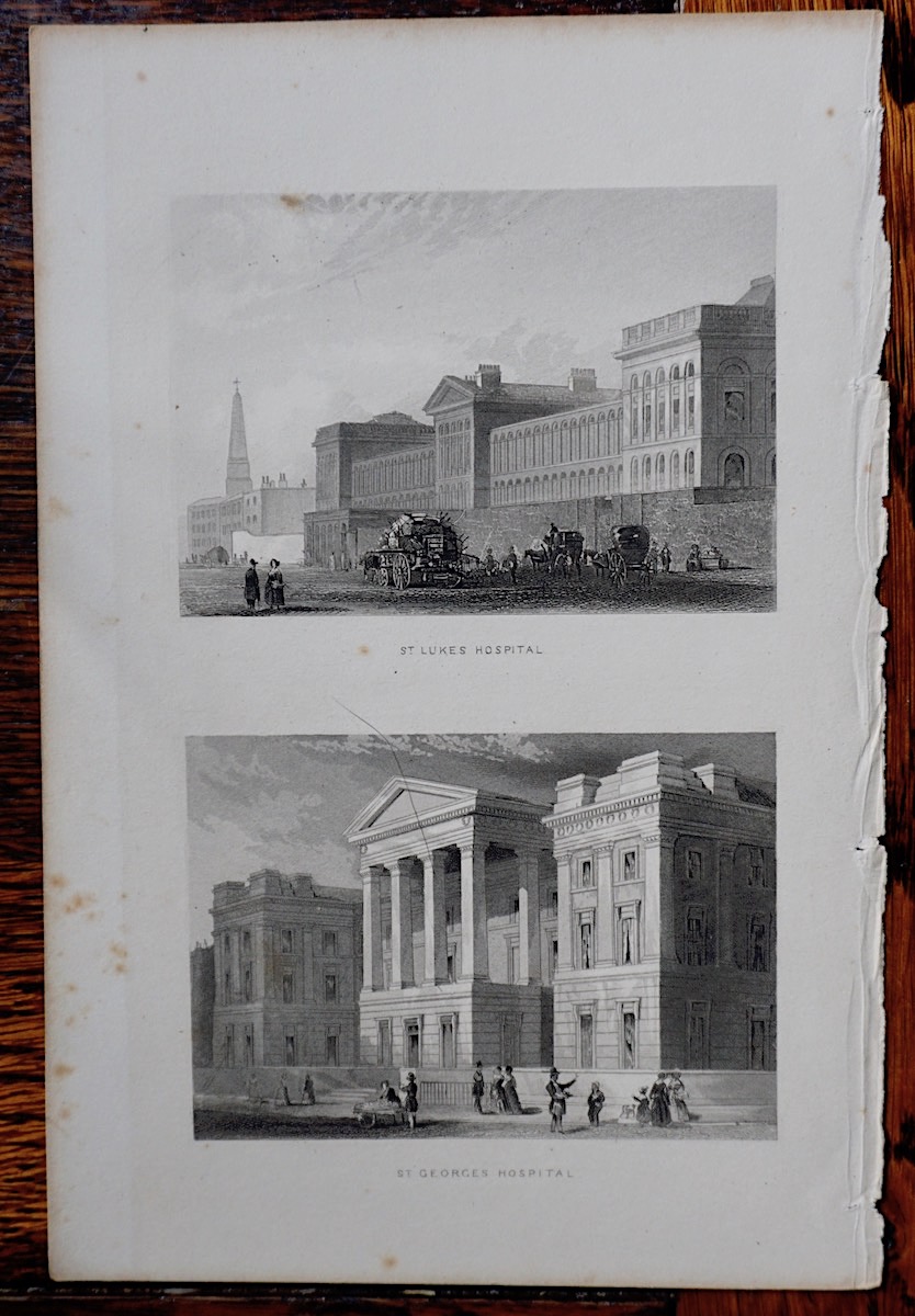 Antique Engraving Print, St. Lukes Hospital; St. Georges Hospital, 1850, credit Antiche Curiosità©
