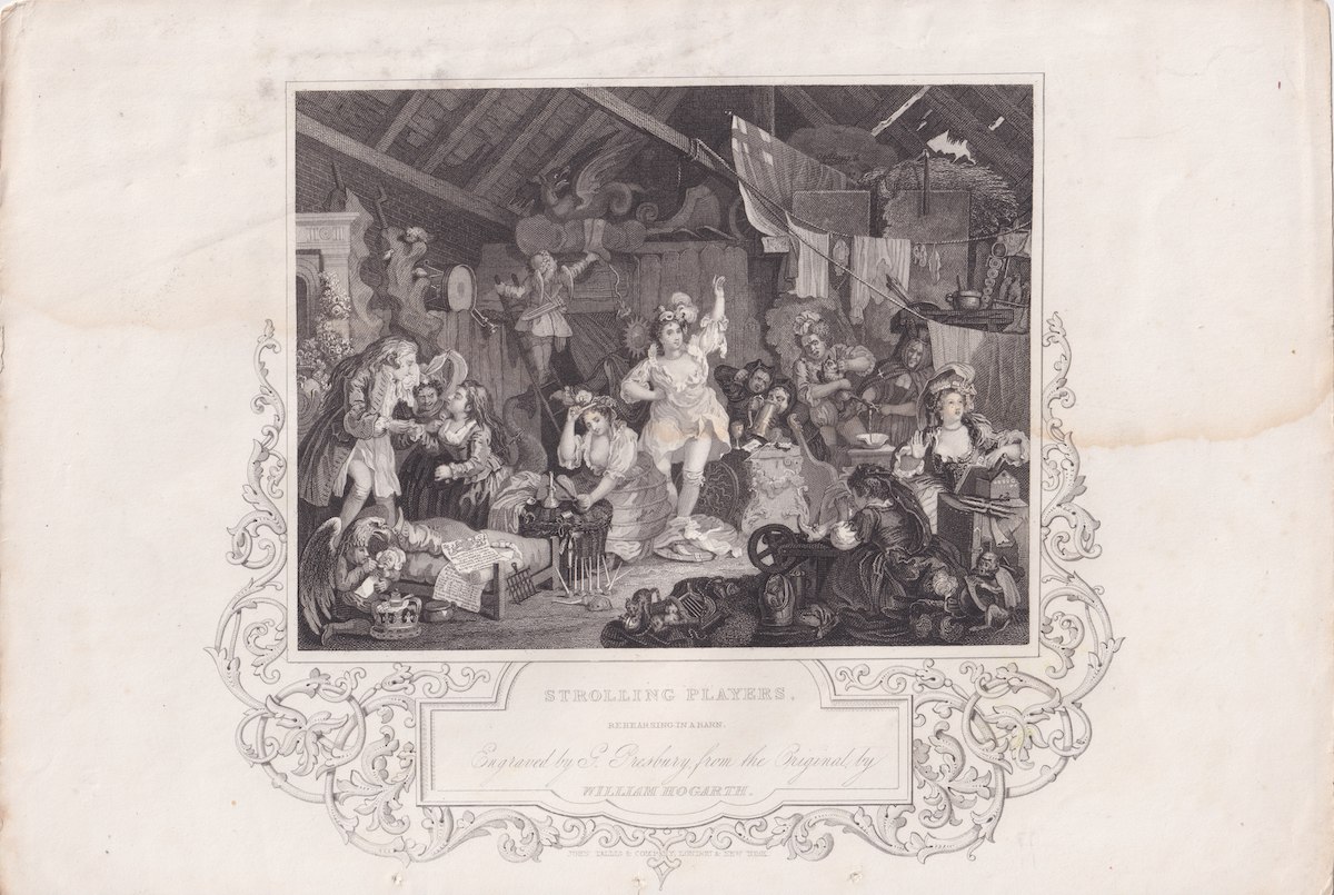 Antique Engraving Print, Strolling Players, 1830, 28.5 x 19.3 cm. Engraved by G. Presbury from the original by William Hogarth.