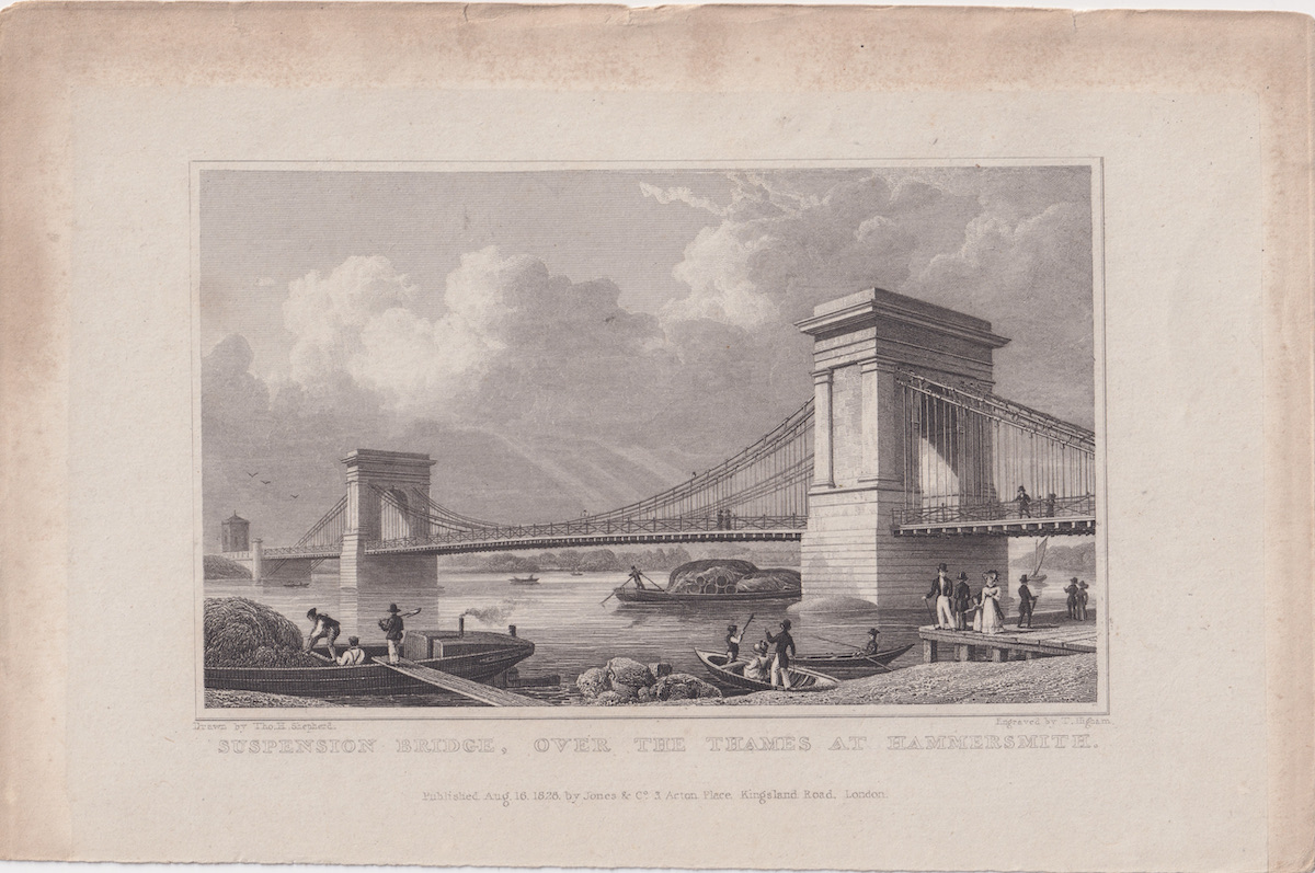 Antique Engraving Print, Suspension Bridge, Hammersmith, 1828, 22 x 14.5 cm.