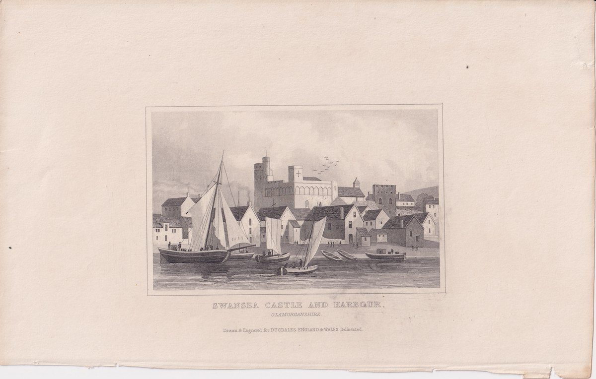 Antique Engraving Print, Swansea Castle and Harbour, Glamorganshire, 1820, 22 x 14 cm.
